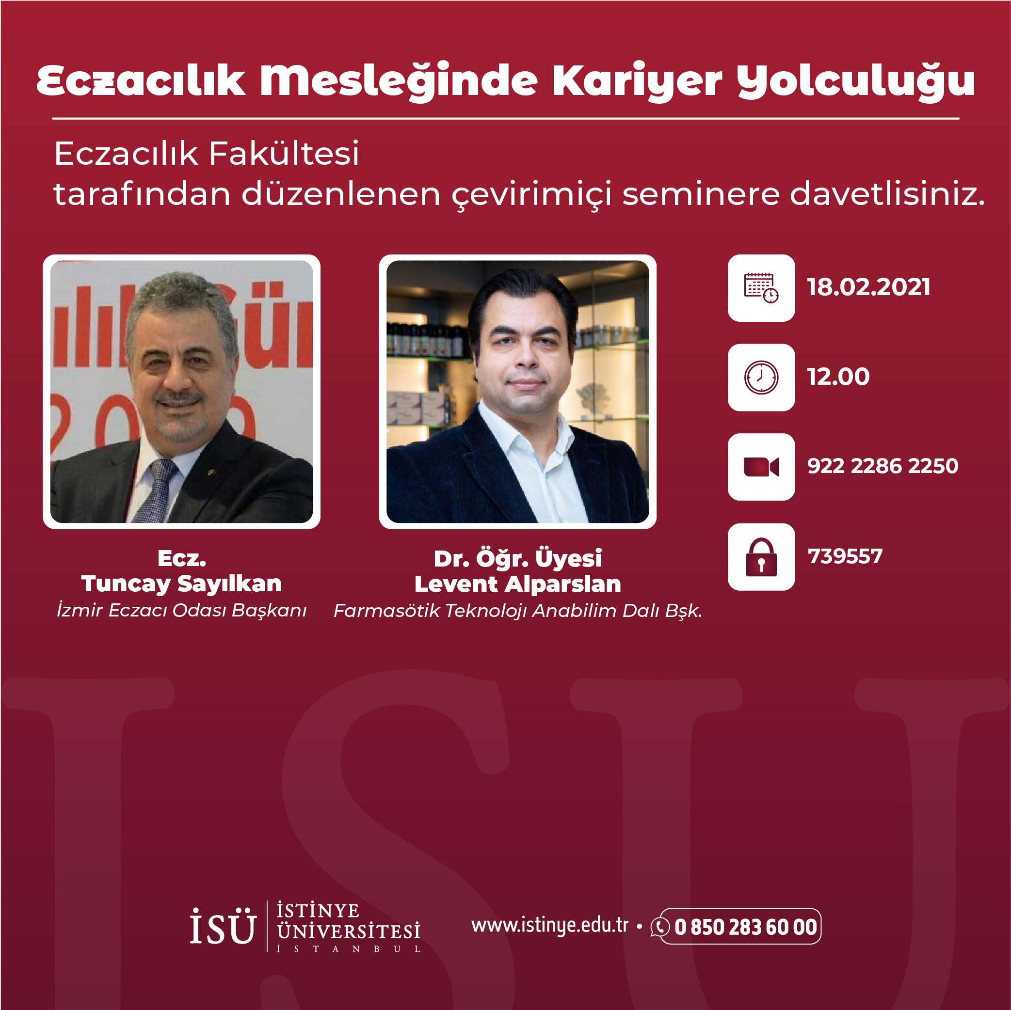 Eczacılık Fakültemiz tarafından düzenlenen "Eczacılık Mesleğinde Kariyer Yolculuğu" programı İzmir Eczacı Odası Başkanı Sayın Tuncay SAYILKAN' ın katılımları ile zoom platformu üzerinden gerçekleşecektir.