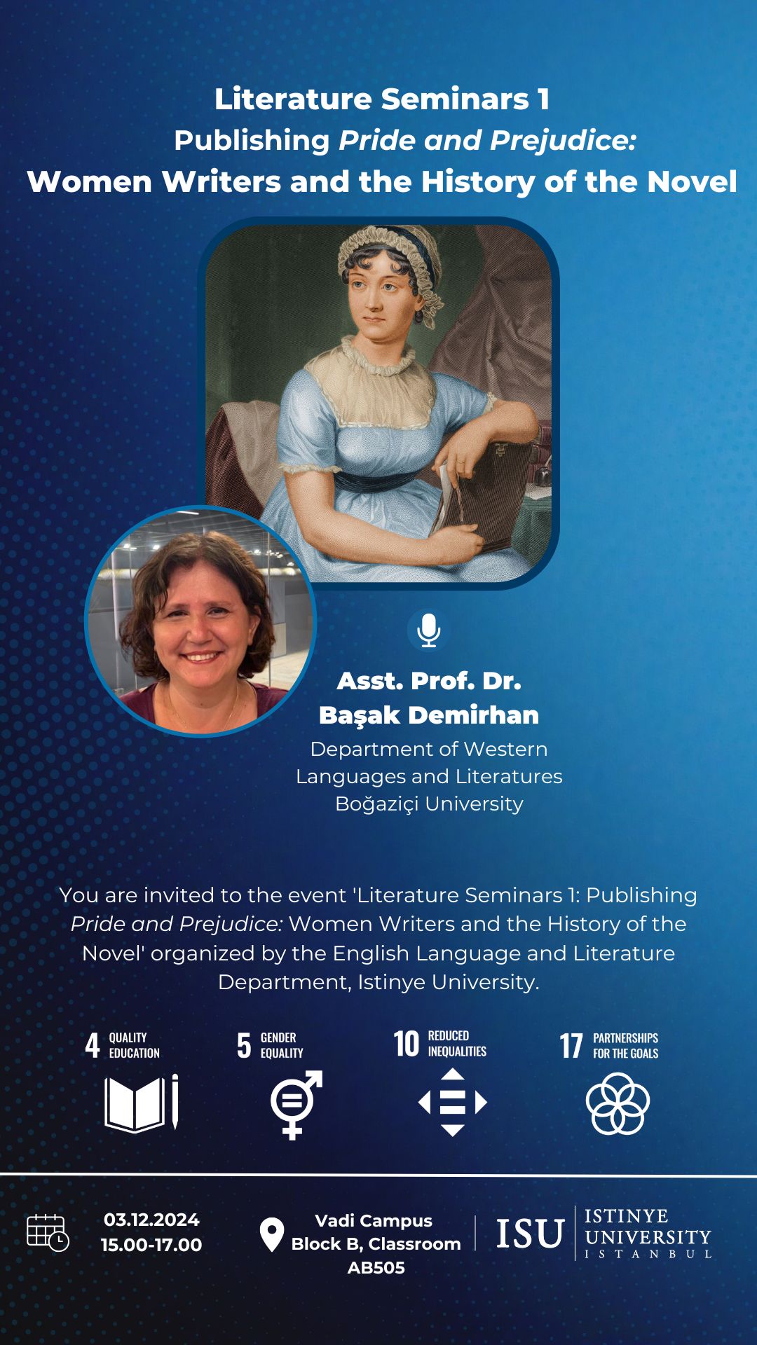 İstinye Üniversitesi, İnsan ve Toplum Bilimleri Fakültesi tarafından 3 Aralık 2024 tarihinde gerçekleştirilecek olan Edebiyat Seminerleri 1: Gurur ve Önyargı'nın Basımı: Kadın Yazarlar ve Romanın Tarihi etkinliğine davetlisiniz.