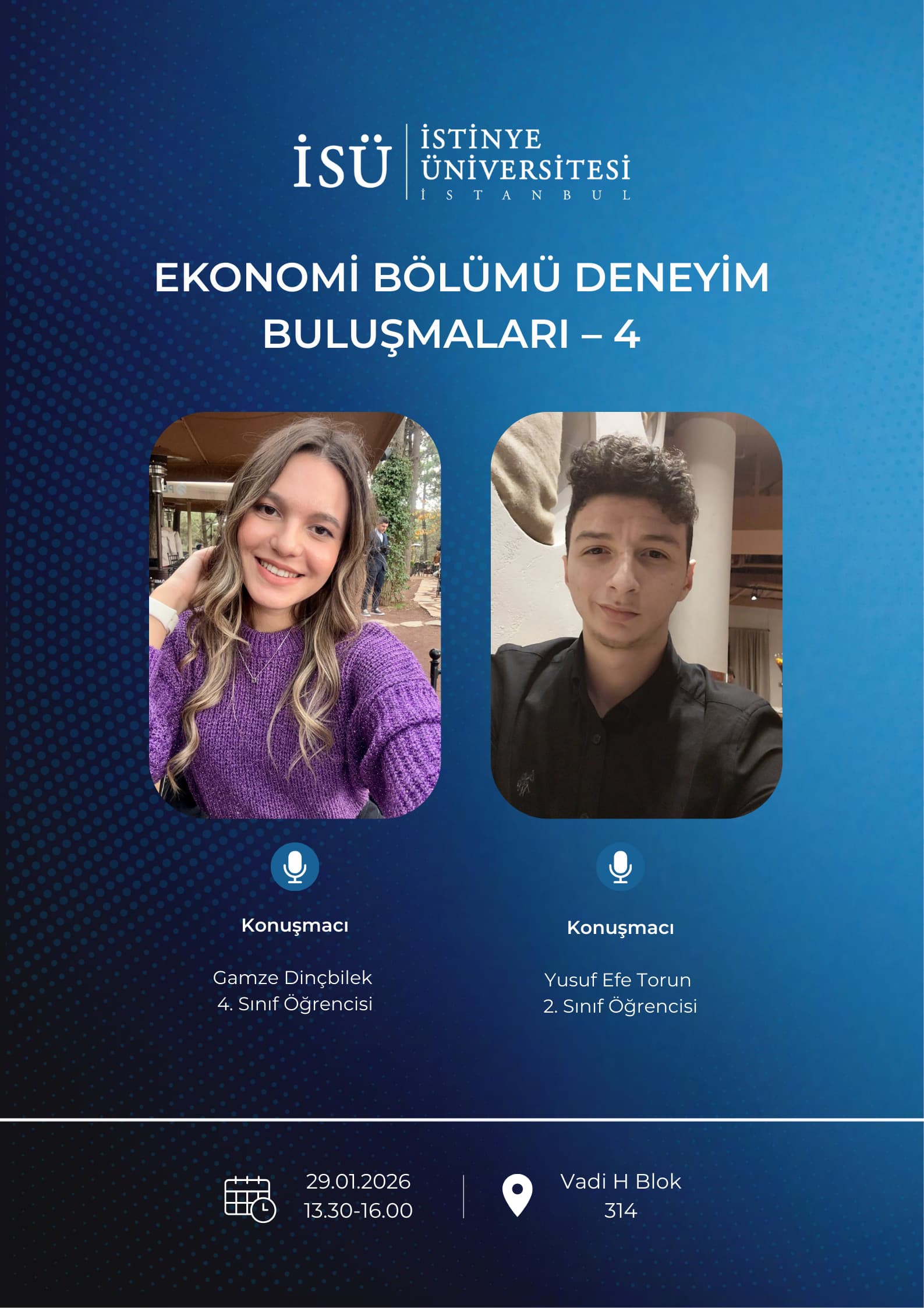 İstinye Üniversitesi, Ekonomi Bölümü tarafından 29 Ocak 2026, saat 13.30'da gerçekleşecek olan “Ekonomi Bölümü Deneyim Paylaşım Toplantıları-4” isimli etkinliğe davetlisiniz.