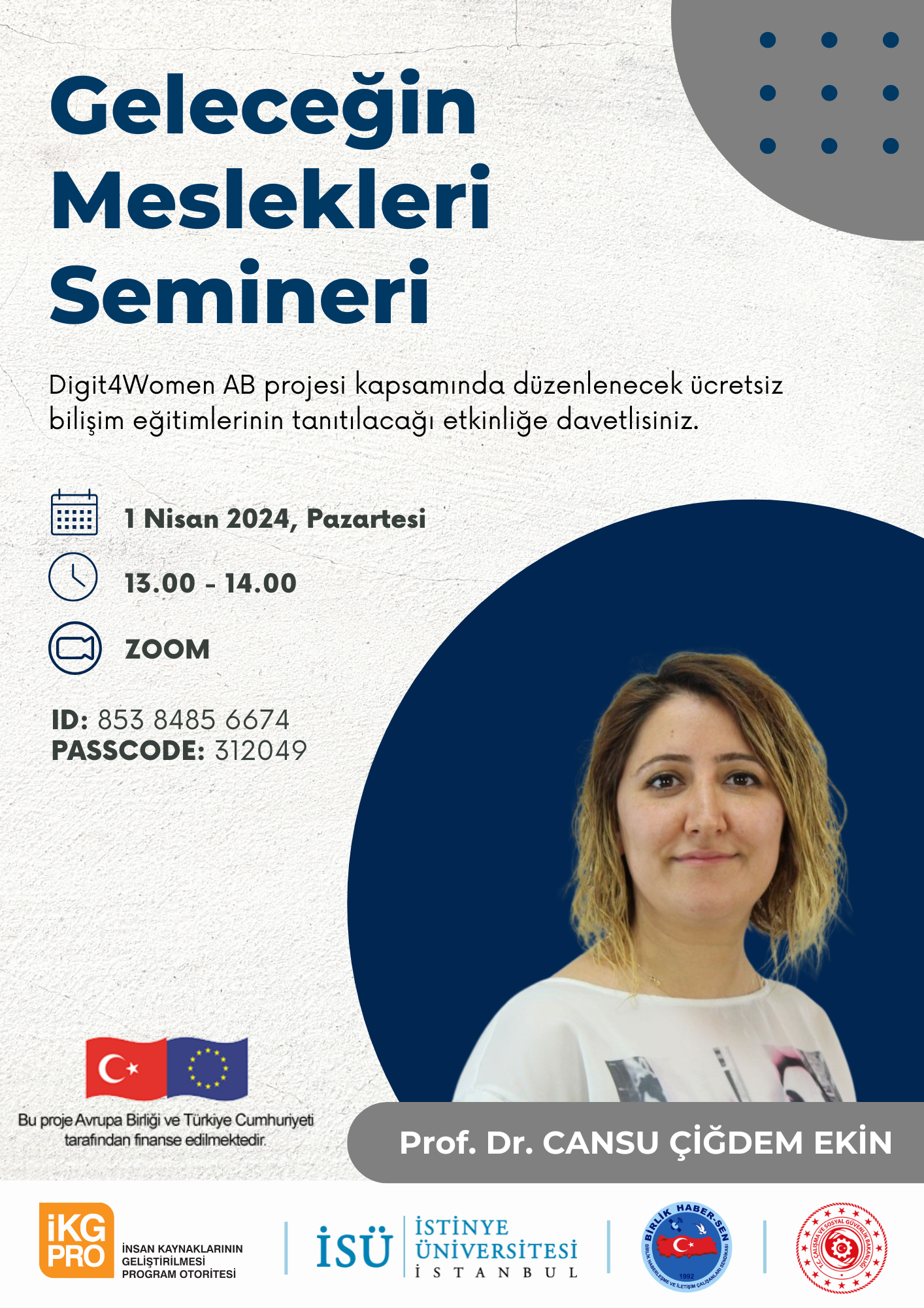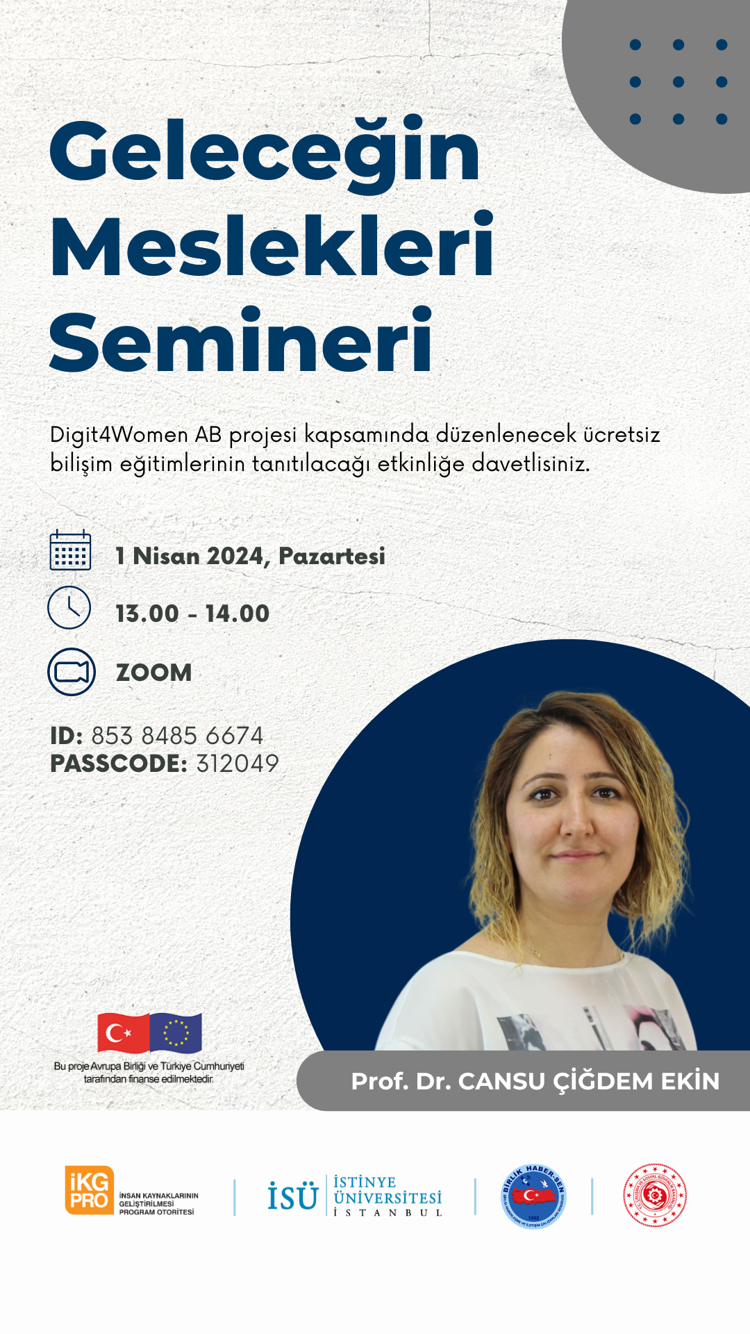İstinye Üniversitesi Toplumsal Cinsiyet ve Kadın Çalışmaları Merkezi iş birliğinde Birlik Haberleşme ve İletişim Çalışanları Sendikası’nın yürüttüğü, Çalışma ve Sosyal Güvenlik Bakanlığı Dış İlişkiler ve Avrupa Birliği Genel Müdürlüğü’nün sözleşme makamı olduğu, Cinsiyet Eşitliği Odağında Geleceğin İnsana yakışır İşleri Yaklaşımının Desteklenmesi Hibe programı kapsamında desteklenen “Digit4Women” AB projesi kapsamında bilişim alanında düzenlenecek “Geleceğin Meslekleri Semineri” etkinliğine davetlisiniz.