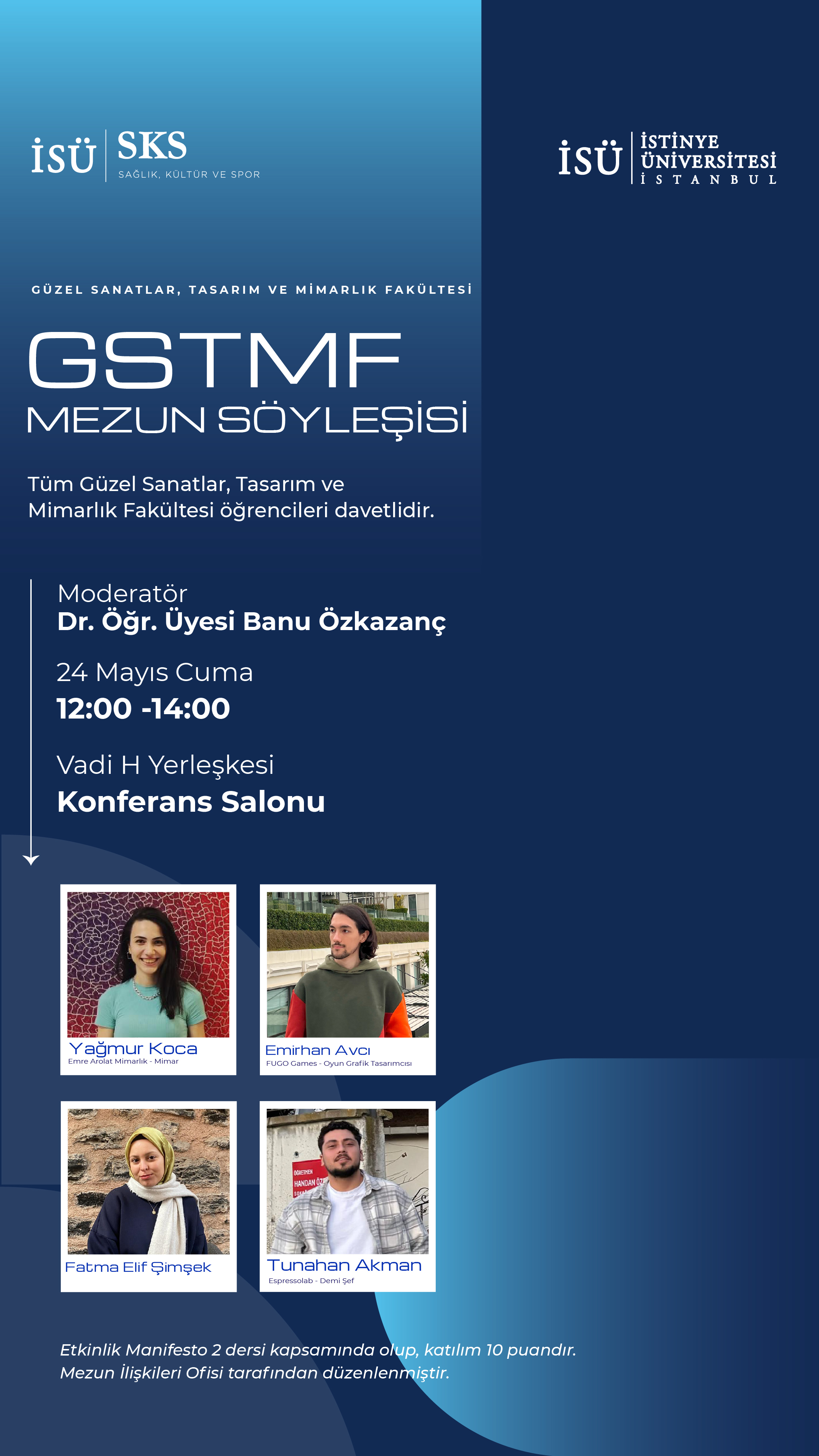 24 Mayıs 2024 Cuma günü saat 12:00'da Vadi H Kampüs Konferans Salonunda gerçekleştirilecek olan Güzel Sanatlar, Tasarım ve Mimarlık Fakültesi Mezun Söyleşisi etkinliğine tüm GSTMF öğrencileri davetlidir.