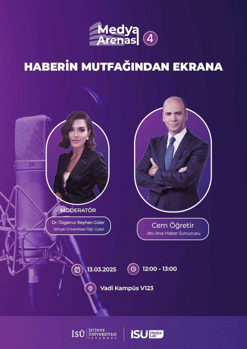 İstinye Üniversitesi İletişim Fakültesi Medya Merkezi tarafından 13 Mart 2025 Perşembe günü, saat 12.00'de Vadi H Yerleşke Konferans Salonu'nda Cem Öğretir'in katılımıyla gerçekleştirilecek olan "Haberin Mutfağından Ekrana" etkinliğine davetlisiniz.
