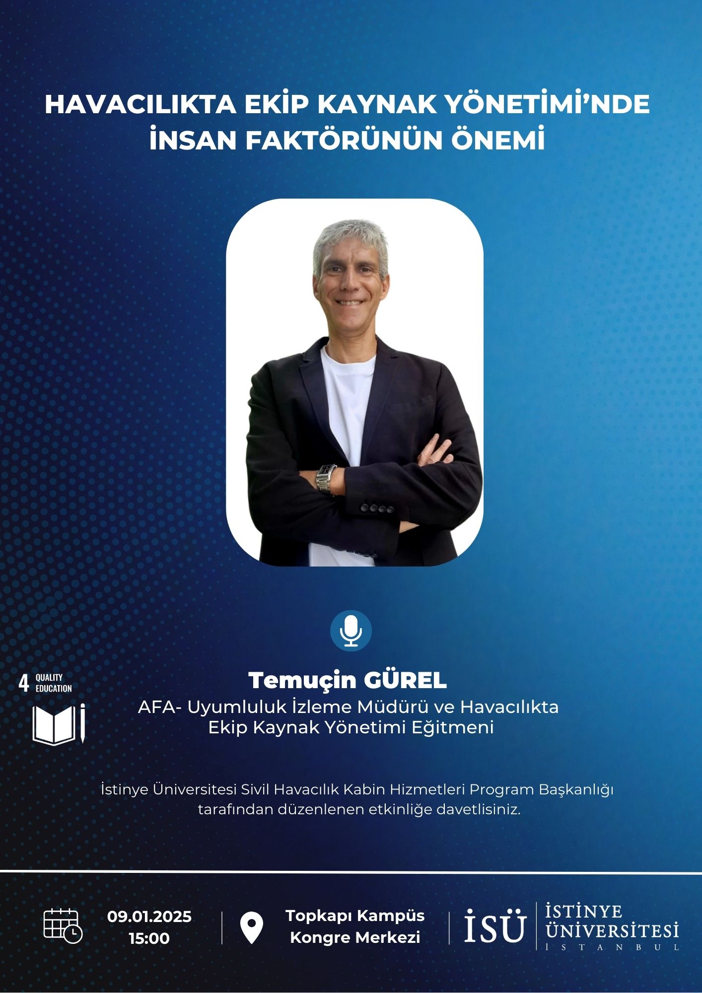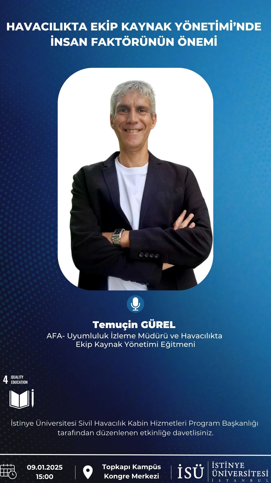 İstinye Üniversitesi Sivil Havacılık Kabin Hizmetleri Programı Başkanlığı tarafından 09 Ocak 2025 Perşembe günü, saat 15.00'da Topkapı Kongre Merkezi'nde gerçekleştirilecek "Havacılıkta Ekip Kaynak Yönetimi ve İnsan Faktörünün Önemi" etkinliğine davetlisiniz.