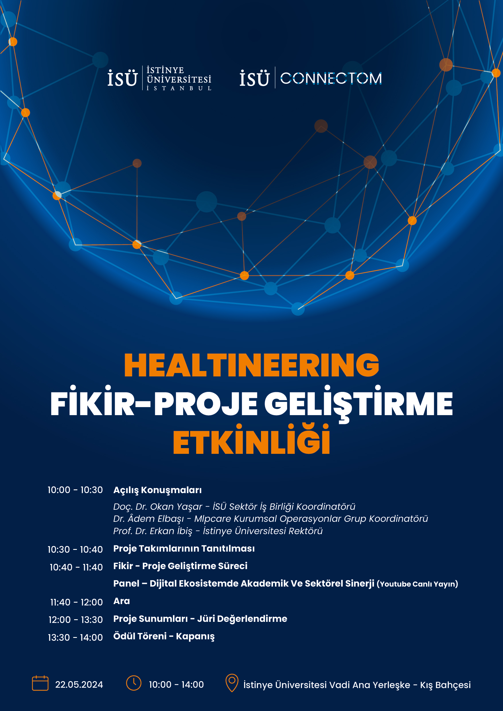 İSÜ CONNECTOM, tarafından 22 Mayıs 2024, Çarşamba günü, 10:00-14:00 saatleri arasında Vadi Ana Yerleşke Kış Bahçesinde gerçekleştirilecek Healtineering Fikir- Proje Geliştirme Etkinliği'ne davetlisiniz.