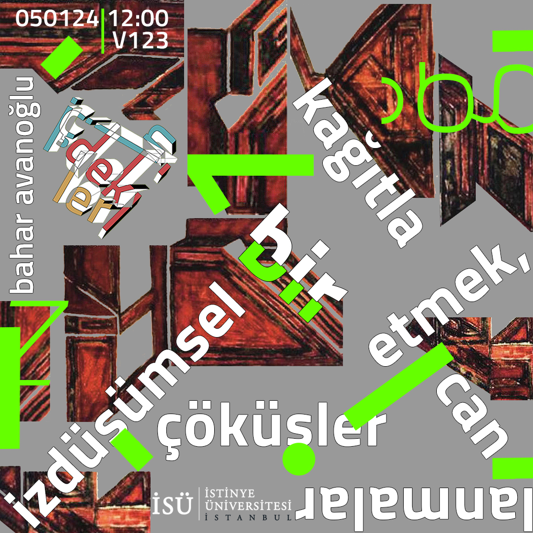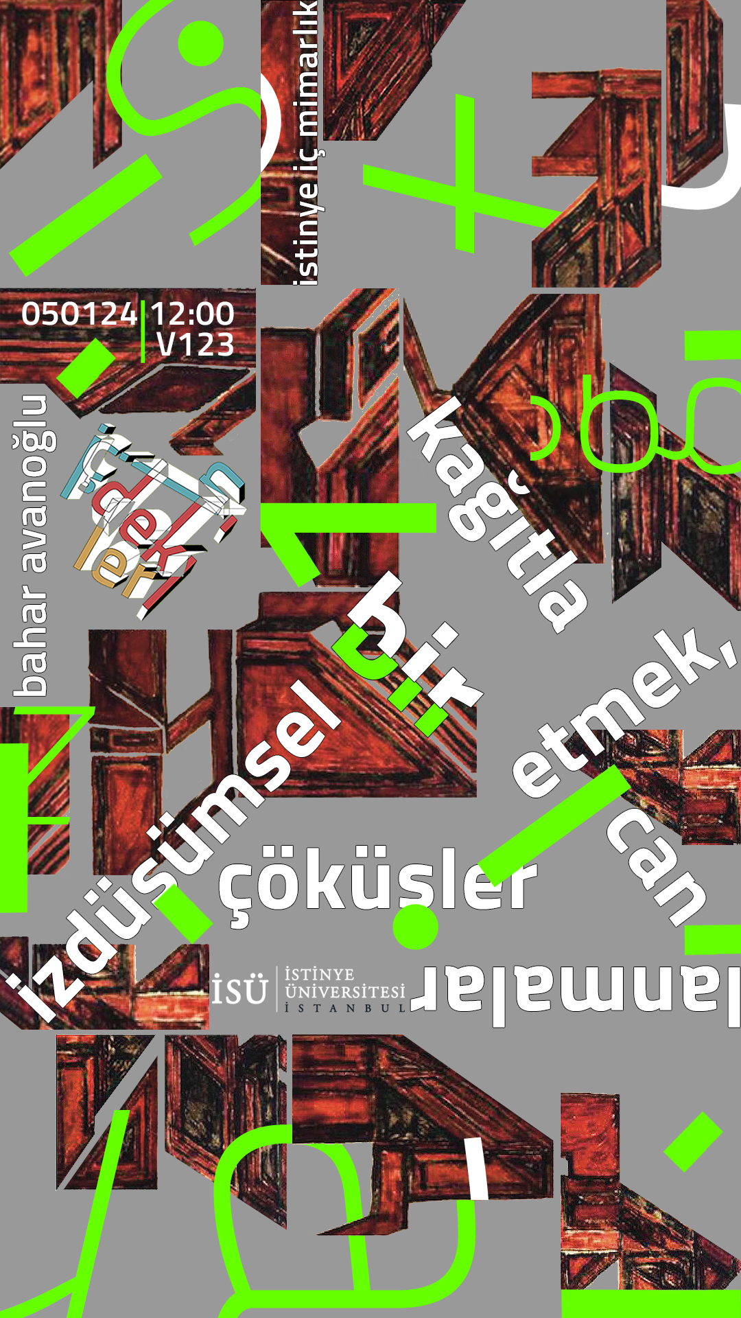 İstinye Üniversitesi Güzel Sanatlar Tasarım ve Mimarlık Fakültesi İç Mimarlık ve Çevre Tasarımı Bölümü tarafından gerçekleştirilen İçindekiler: Spekülatif Mekân Araştırmaları ilk etkinliği için Bahar Avanoğlu’nu konuk ediyor. Avanoğlu’nun, “Kağıtla bir Etmek, İzdüşümsel Çöküşler | Canlanmalar” adlı sunumu 5 Ocak 2024 saat 12:00’de İstinye Üniversitesi Vadi H Yerleşkesi V123 nolu konferans salonunda gerçekleşecek. Etkinliğe katılım herkese açıktır.