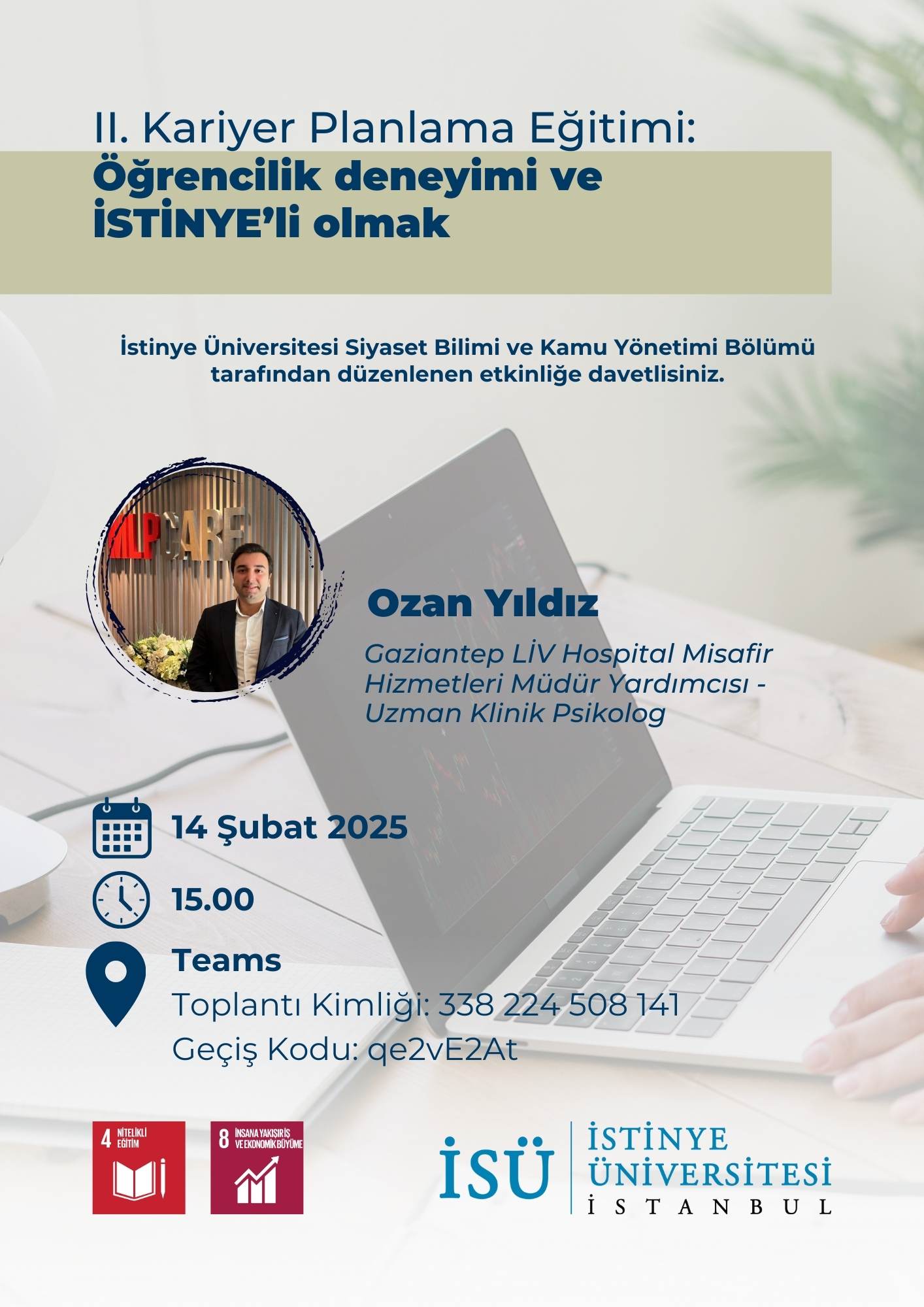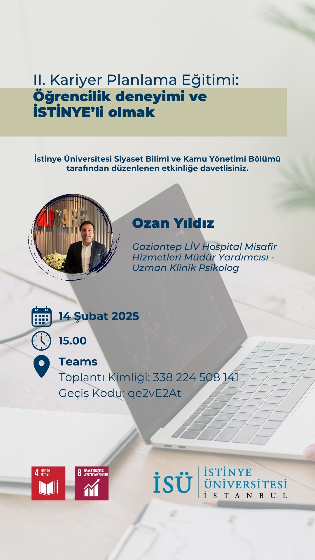 İstinye Üniversitesi İktisadi, İdari ve Sosyal Bilimler Fakültesi Siyaset Bilimi ve Kamu Yönetimi Bölümü tarafından düzenlenen II. Kariyer Planlama Eğitimi: Öğrencilik deneyimi ve İSTİNYE’li olmak etkinliğine davetlisiniz.
