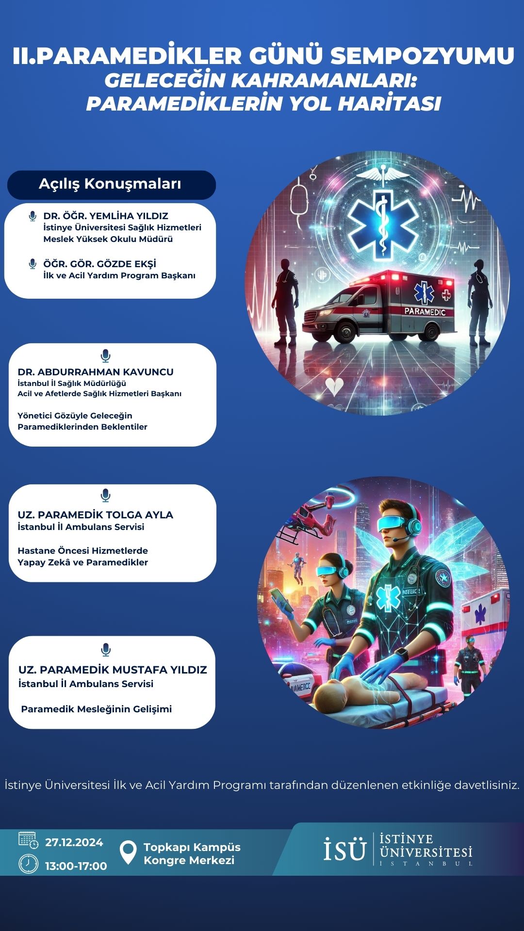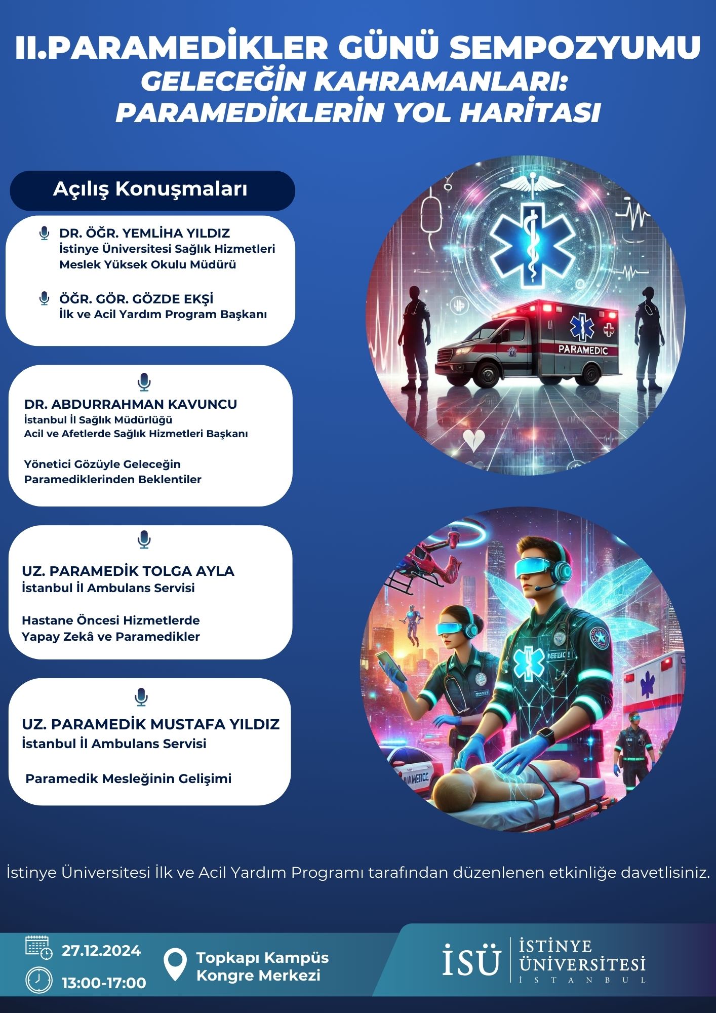 İstinye Üniversitesi İlk ve Acil Yardım Programı tarafından 27 Aralık 2024 Cuma günü, saat 13.00'de Topkapı Kampüsü Kongre Merkezi'nde gerçekleştirilecek olan "Geleceğin Kahramanları: Paramediklerin Yol Haritası" konulu II.Paramedikler Günü Sempozyumu'na davetlisiniz.