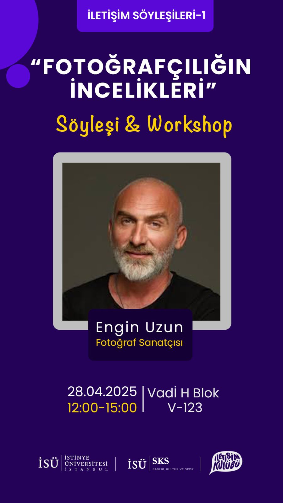 İstinye Üniversitesi İletişim Kulübü tarafından 28 Nisan 2025 Pazartesi günü, saat 12.00'da Vadi H Yerleşke V-123 Konferans Salonu'nda gerçekleştirilecek olan "İletişim Söyleşileri 1: Fotoğrafçılığın İncelikleri Söyleşi & Workshop" etkinliğine davetlisiniz.