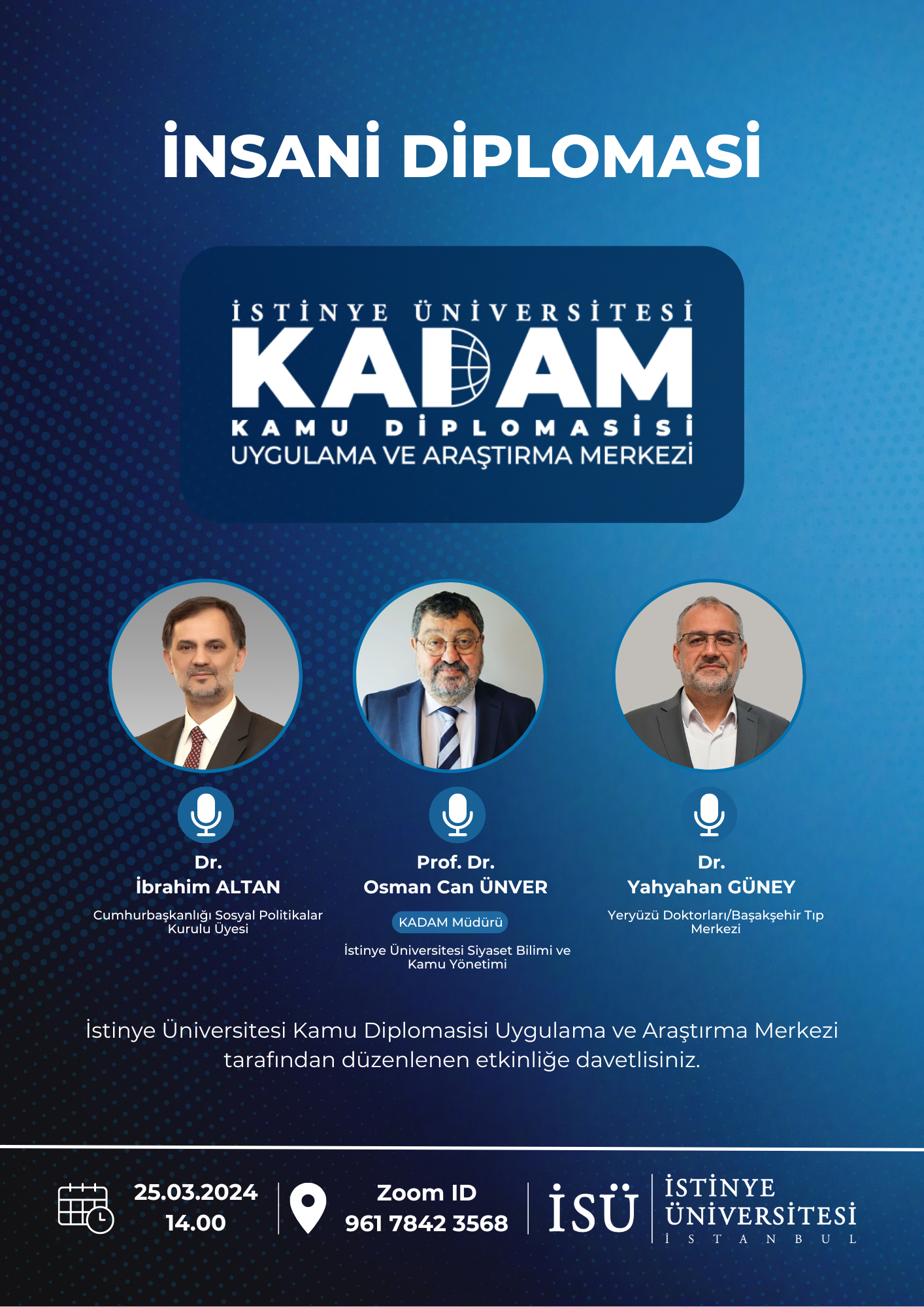 İstinye Üniversitesi Kamu Diplomasisi Uygulama ve Araştırma Merkezi tarafından 25 Mart 2024 Pazartesi günü saat 14:00'da çevrim içi olarak gerçekleştirilecek etkinliğe davetlisiniz.