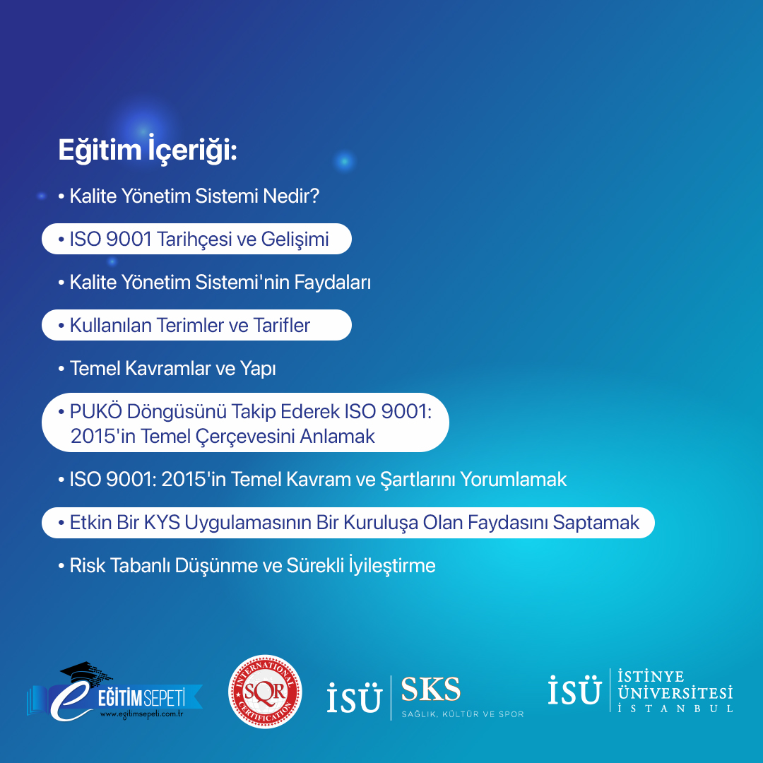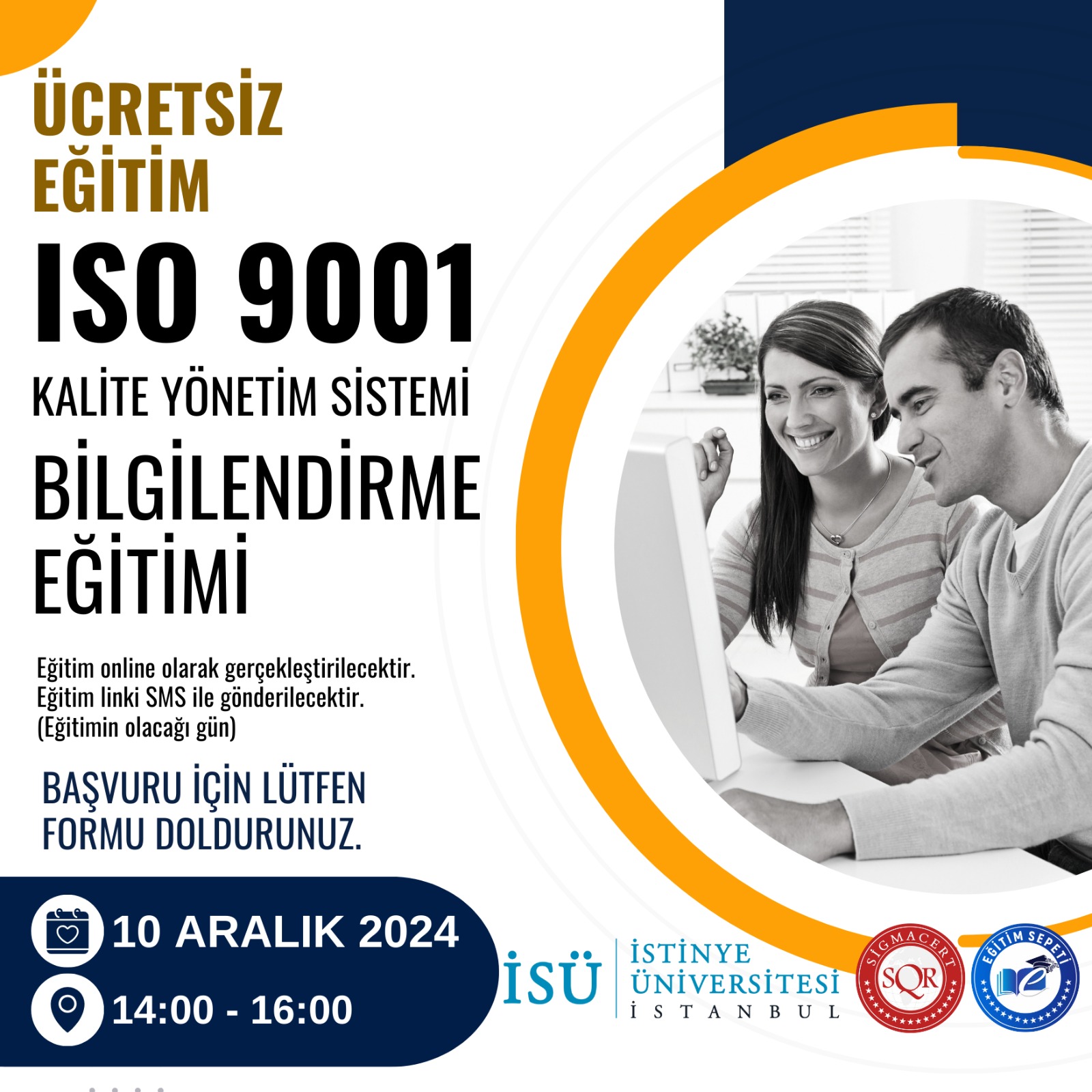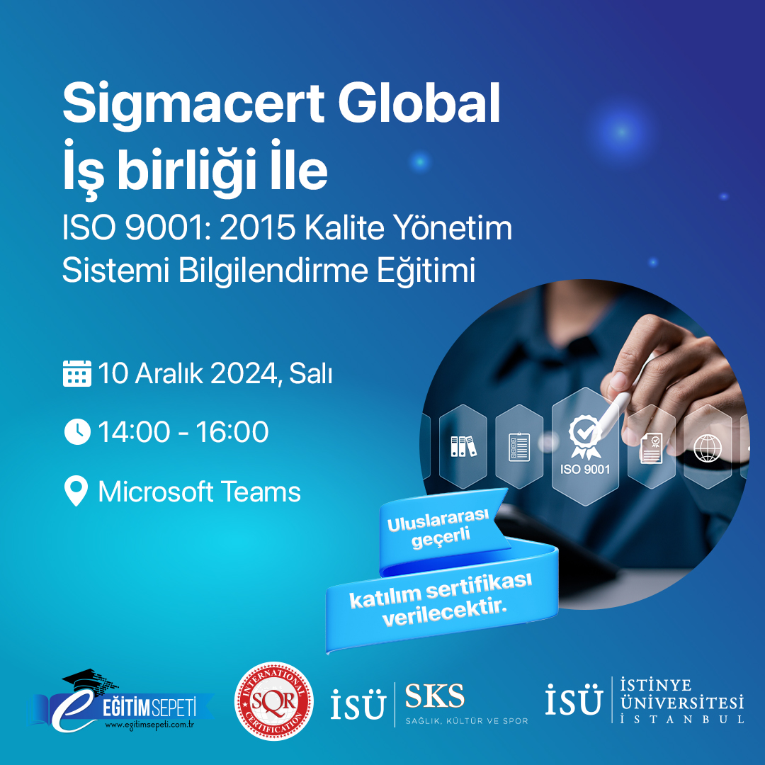 İş dünyasının vazgeçilmez süreci olan yönetim sistemleri konusunda siz değerli öğrencilerimizi ve mezunlarımızı bilgilendirmek, iş başvurularında öğrenci ve mezunlarımızın bir adım daha önde olmasını sağlamak, yeni sektörün varlığını öğrenci ve mezunlarımıza aktarmak için ücretsiz olarak Sigmacert Global iş Birliği ile ISO 9001:2015 Kalite Yönetim Sistemi Bilgilendirme Eğitimi verilecektir.