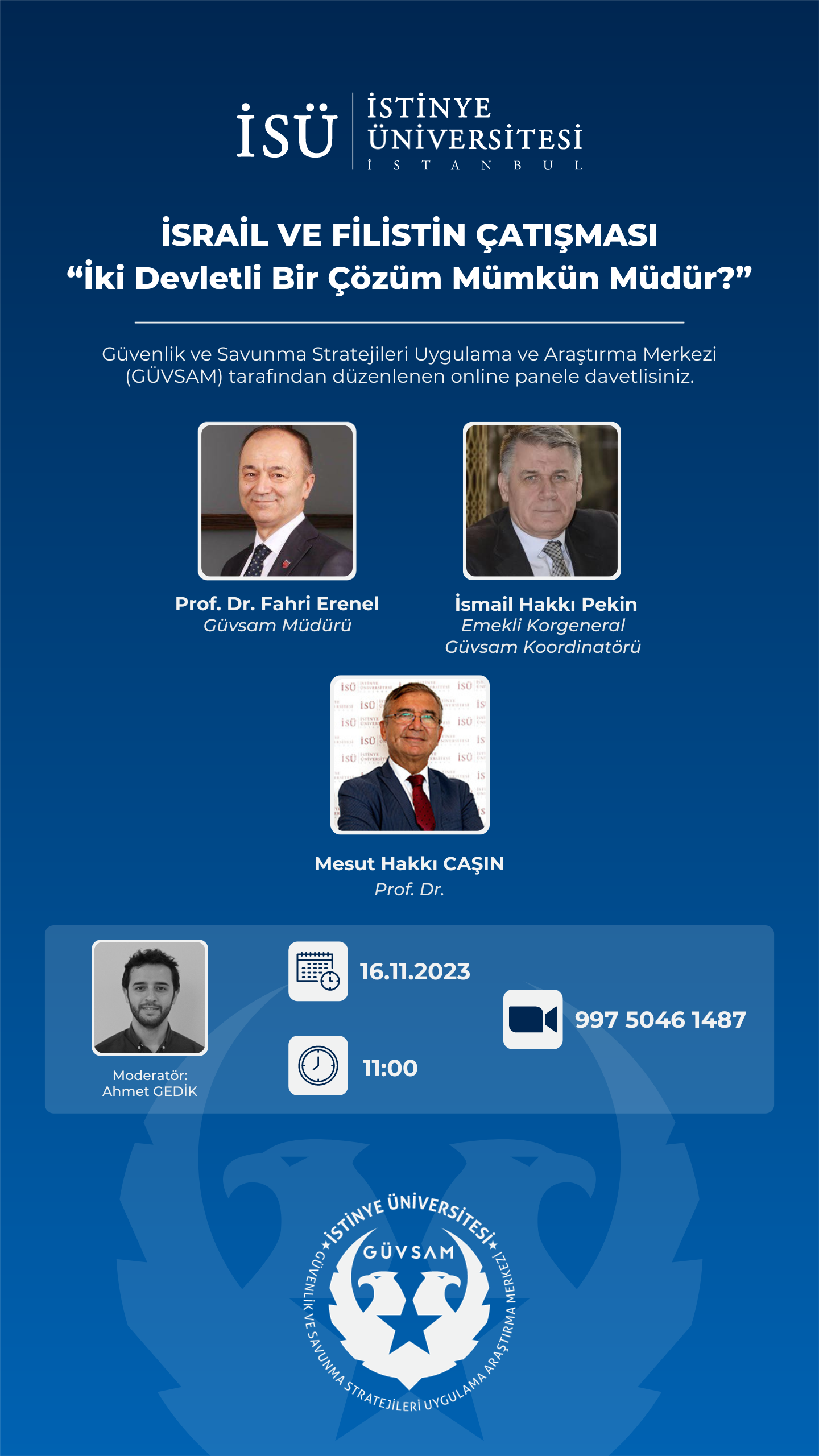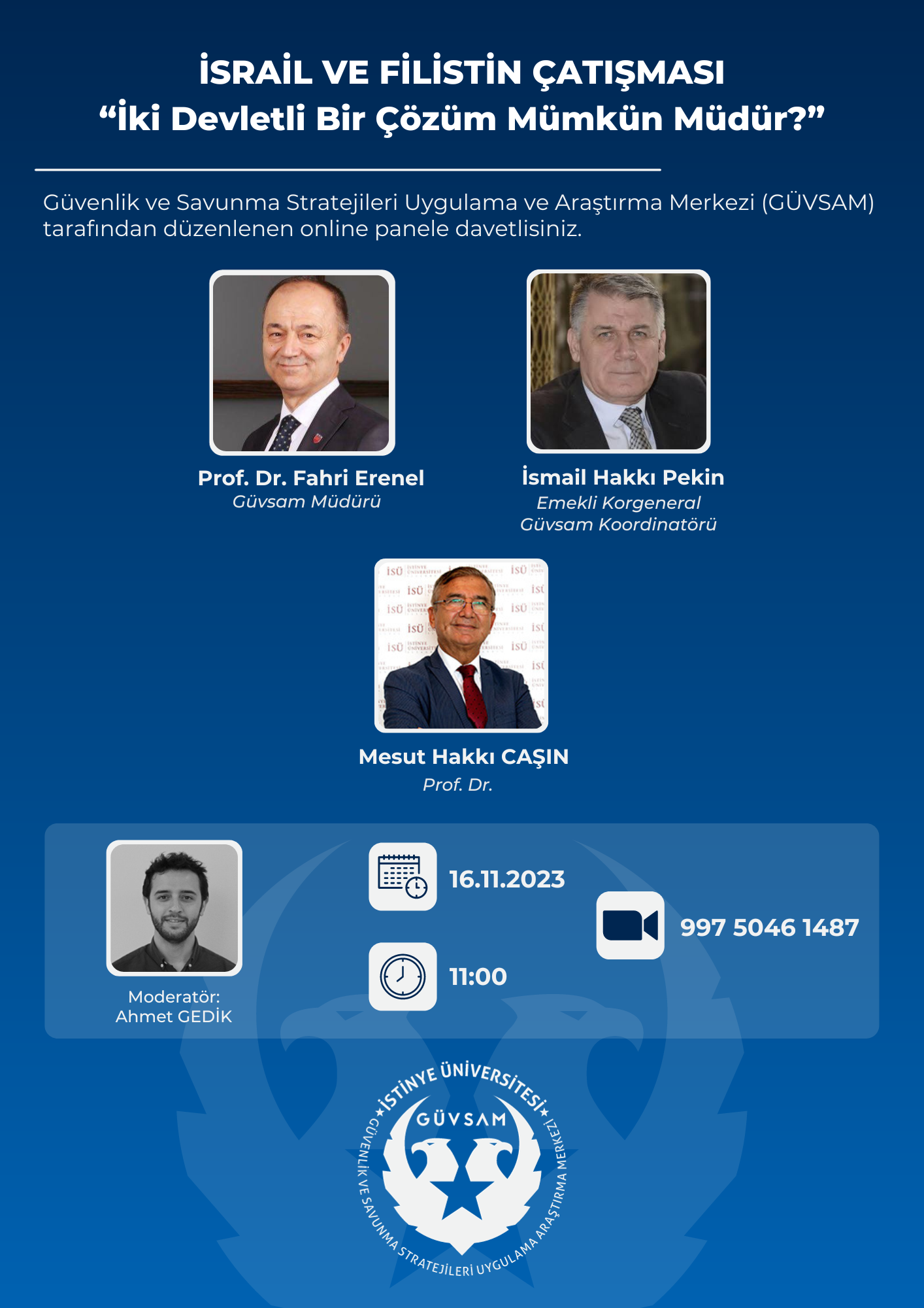 Güvenlik ve Savunma Stratejileri Uygulama ve Araştırma Merkezi (GÜVSAM) tarafından 16 Kasım 2023 Perşembe günü saat 11.00'de çevrim içi olarak gerçekleştirilecek etkinliğe davetlisiniz.