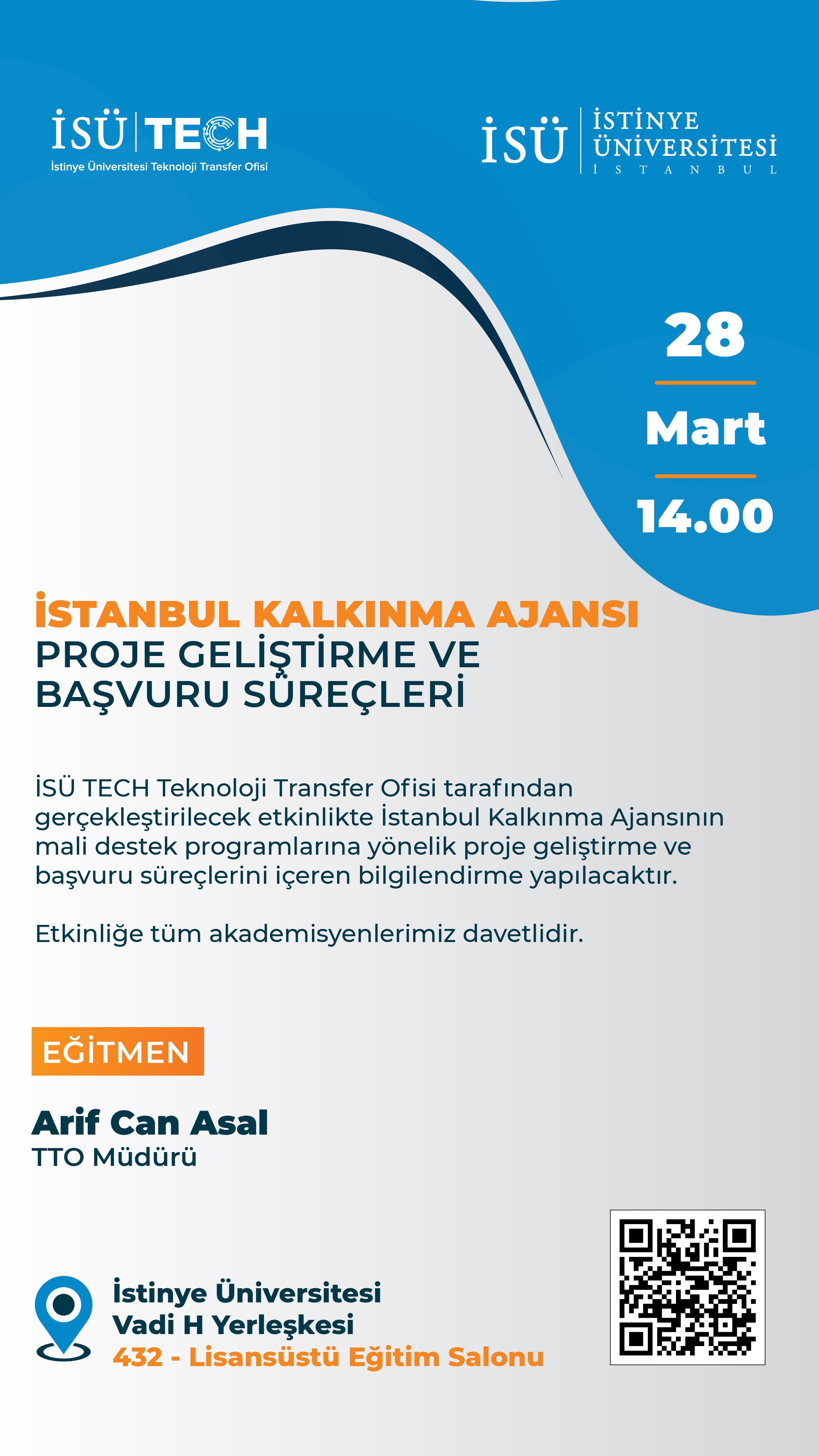 Vadi H Yerleşkesi 432 numaralı Lisansüstü Eğitim Salonunda gerçekleştirilecek etkinlikte, Teknoloji Transfer Ofisi Müdürü Arif Can Asal tarafından İstanbul Kalkınma Ajansı’nın mali destek programlarının tanıtımı ve proje geliştirme/başvuru süreçleri hakkında detaylı bilgilendirme yapılacaktır.