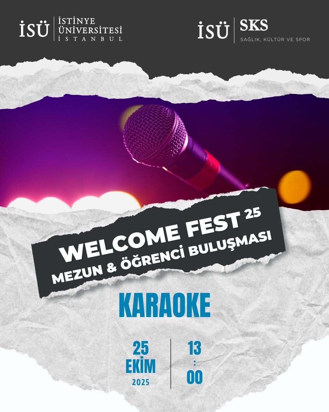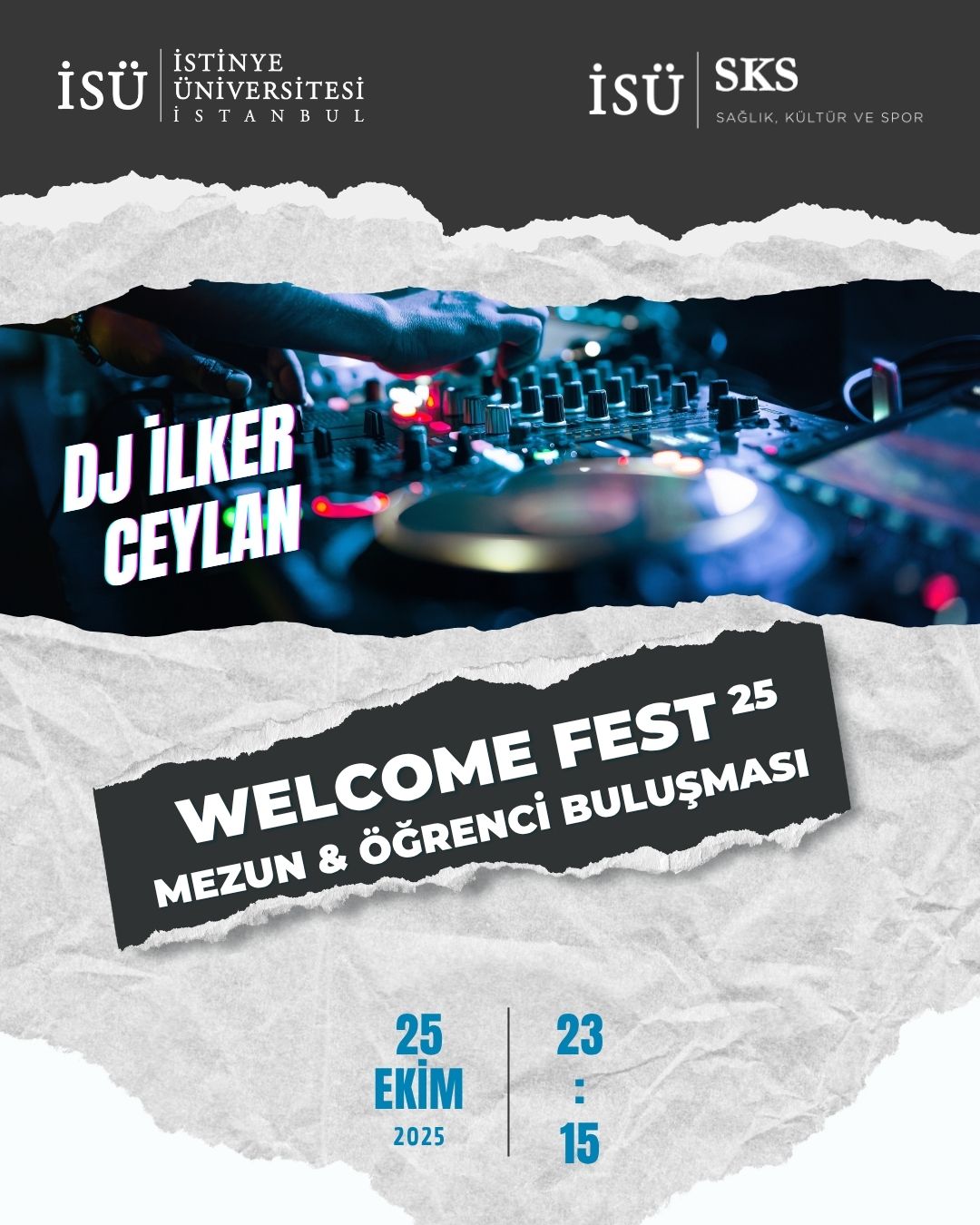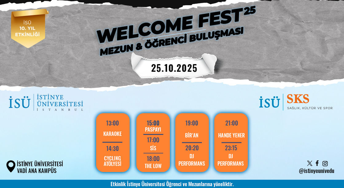 İstinye Üniversitesi’nin 10. yılına özel olarak düzenlenen Welcome Fest'25 – Mezun & Öğrenci Buluşması, 25 Ekim 2025 Cumartesi günü Vadi Ana Yerleşke’de gerçekleştirilecektir.