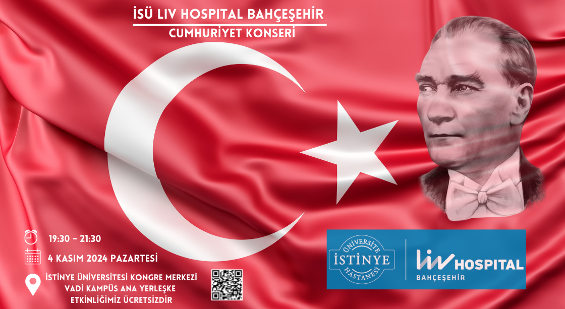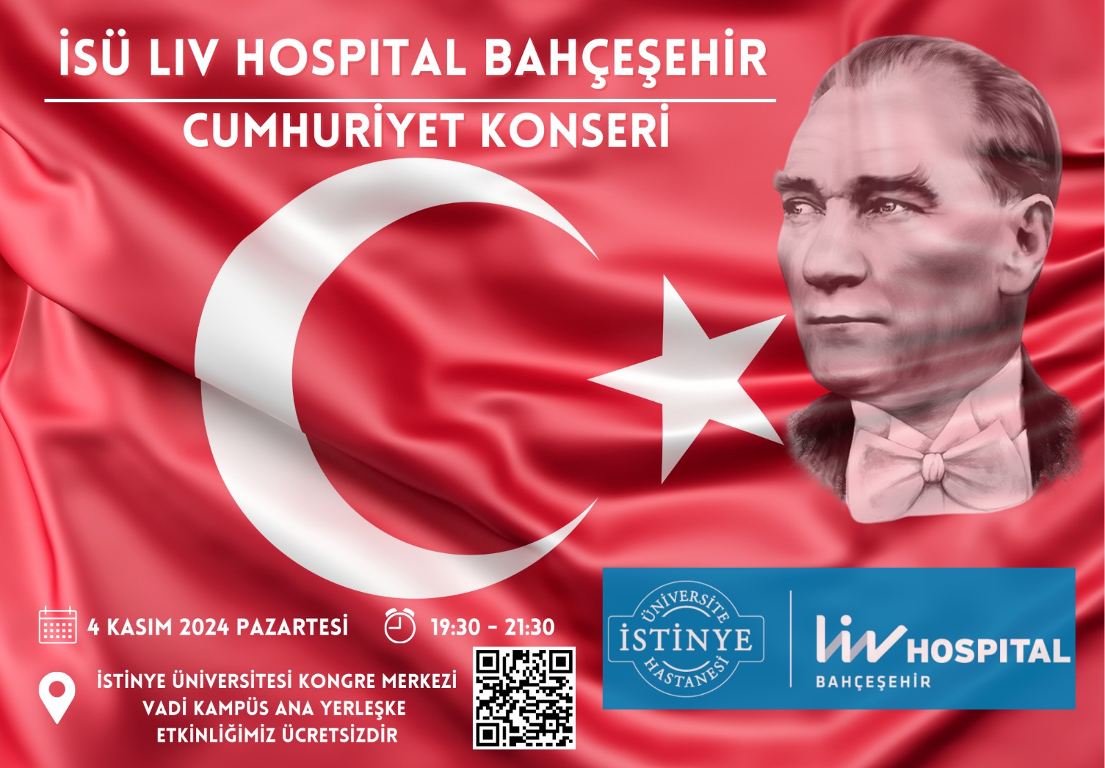İstinye Üniversitesi, Liv Bahçeşehir Hastanesi tarafından 04 Kasım 2024 Pazartesi günü İstinye Üniversitesi Kongre Merkezi, Vadi Kampüs Ana Yerleşke'de gerçekleştirilecek "Cumhuriyet Konseri” etkinliğine davetlisiniz.