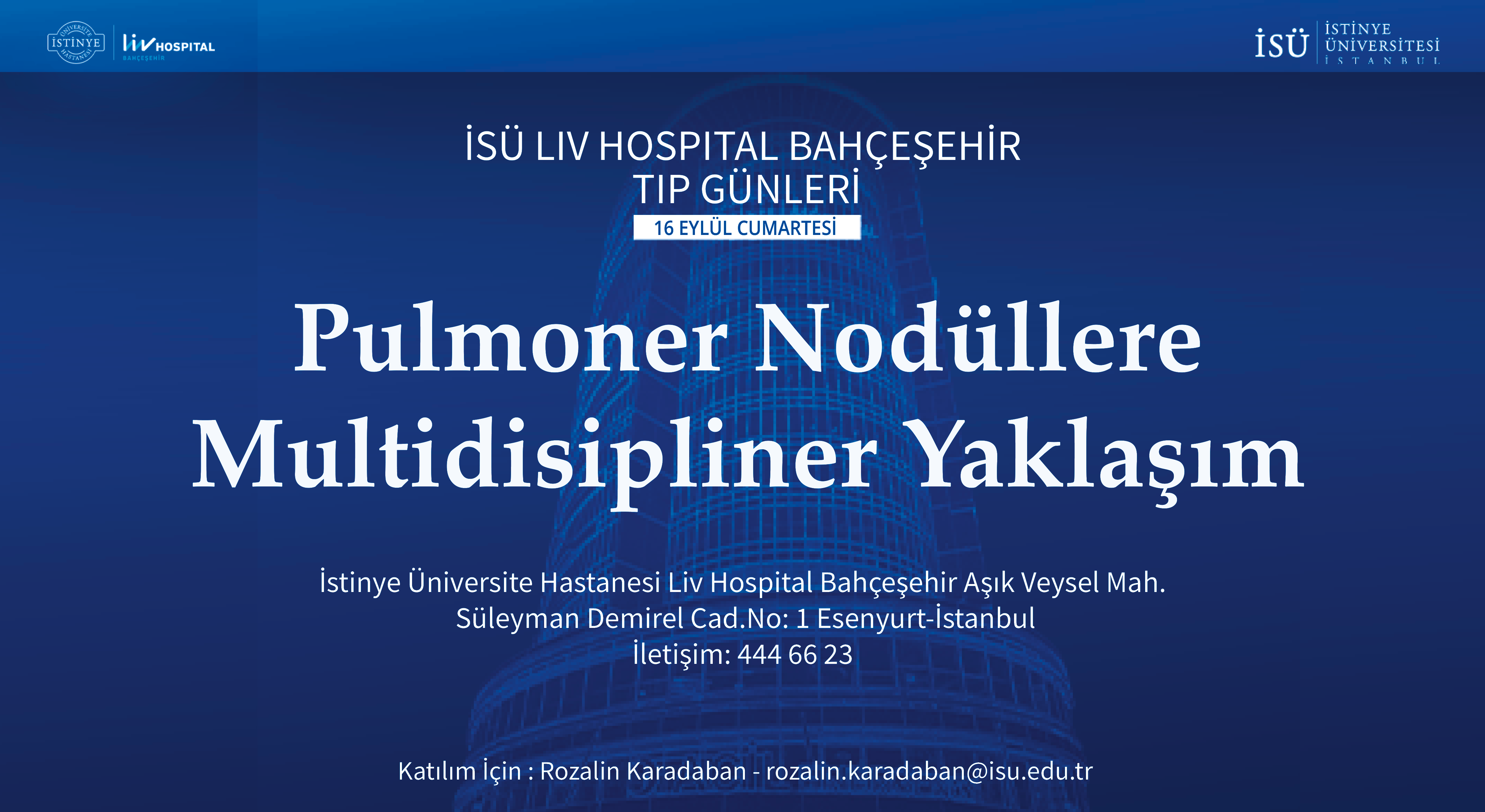 İSÜ Liv Hospital Bahçeşehir Tıp Günleri Pulmoner Nodüllere Multidispliner Yaklaşım Sempozyumu 16 Eylül Cumartesi 2023 tarihinde İstinye Üniversitesi Tıp Fakültesi Göğüs Hastalıkları Ana Bilim dalı başkanı Doç. Dr. Adil Can Güngen Başkanlığında değerli hekimlerin katılımıyla gerçekleştirilecek.