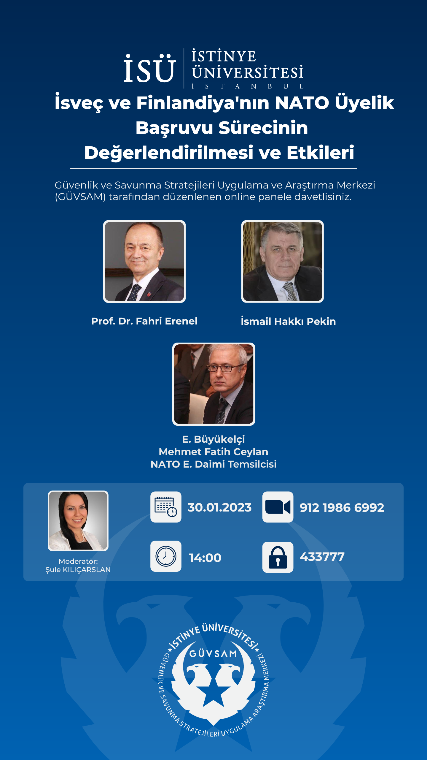 Güvenlik ve Savunma Stratejileri Uygulama ve Araştırma Merkezi (GÜVSAM) tarafından 30 Ocak Pazartesi günü saat 14.00'de çevrim içi olarak gerçekleştirilecek etkinliğe davetlisiniz.