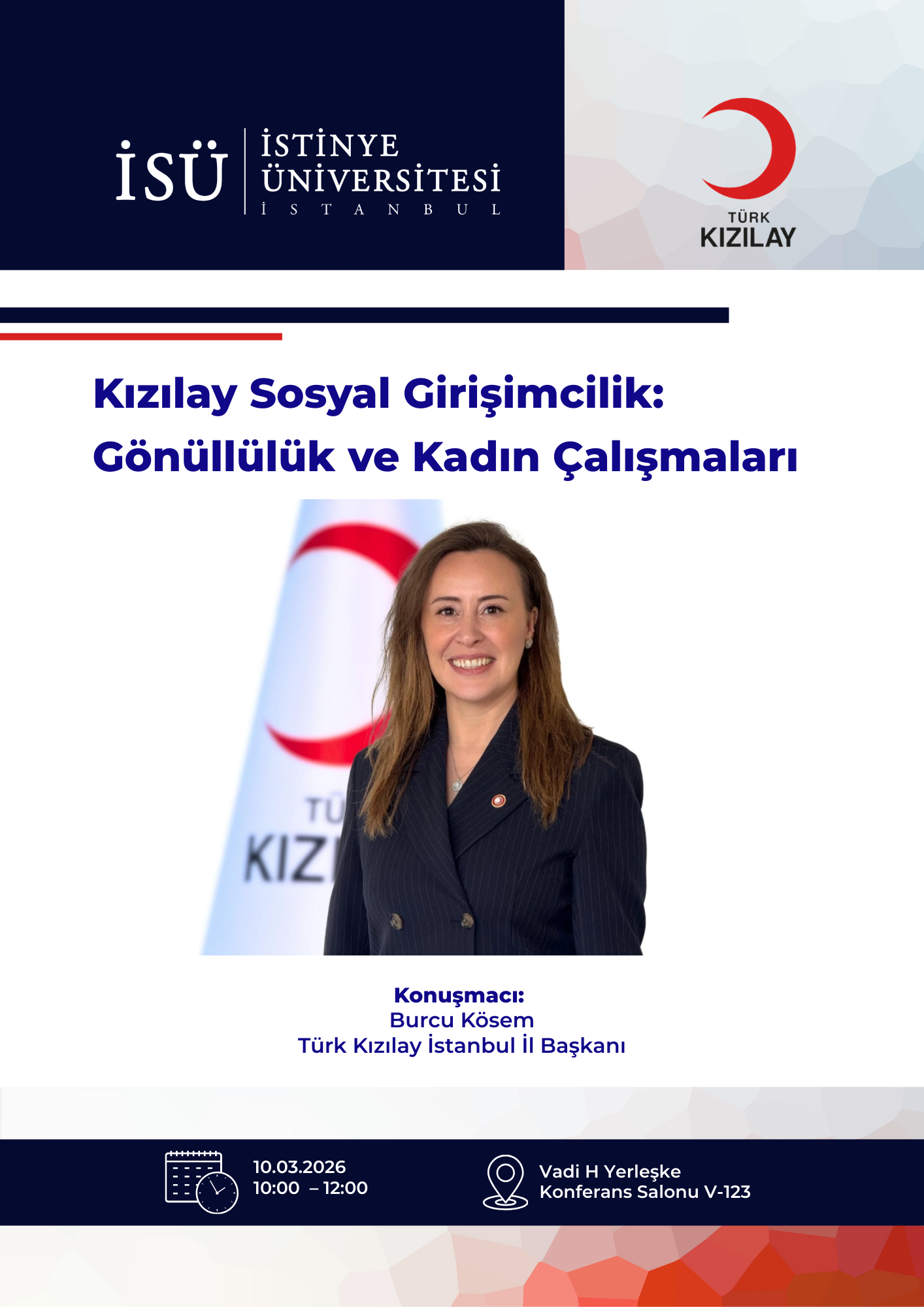 İstinye Üniversitesi, İktisadi, İdari ve Sosyal Bilimler Fakültesi tarafından 10 Mart 2026, saat 10.00'da gerçekleşecek olan “Kızılay Sosyal Girişimcilik: Gönüllülük ve Kadın Çalışmaları” isimli etkinliğe davetlisiniz.