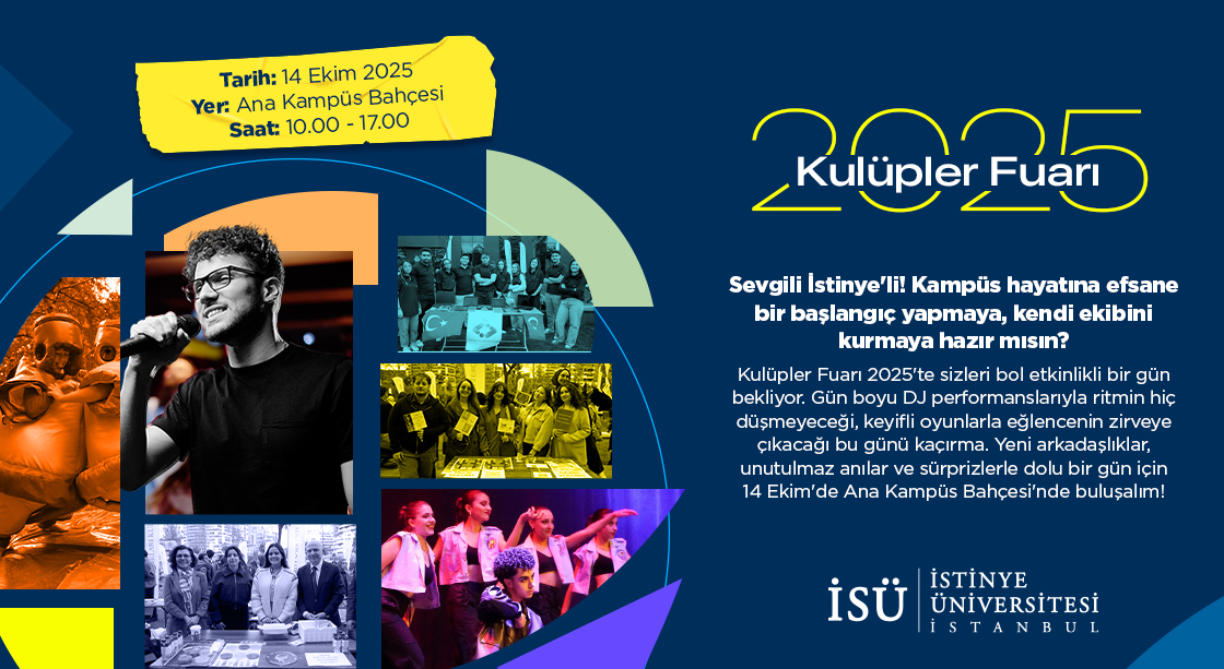 İstinye Üniversitesi Sağlık, Kültür ve Spor Daire Başkanlığı tarafından 14 Ekim 2025 Salı günü Vadi Ana Kampüs Bahçesinde gerçekleştirilecek Kulüpler Fuarı'na davetlisiniz.