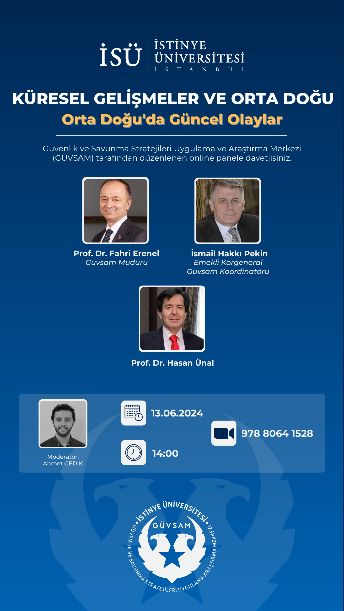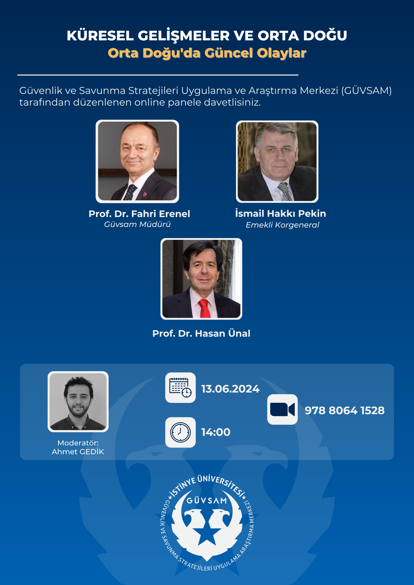 Güvenlik ve Savunma Stratejileri Uygulama ve Araştırma Merkezi (GÜVSAM) tarafından 13 Haziran 2024 Perşembe günü saat 14.00'da çevrim içi olarak gerçekleştirilecek etkinliğe davetlisiniz.