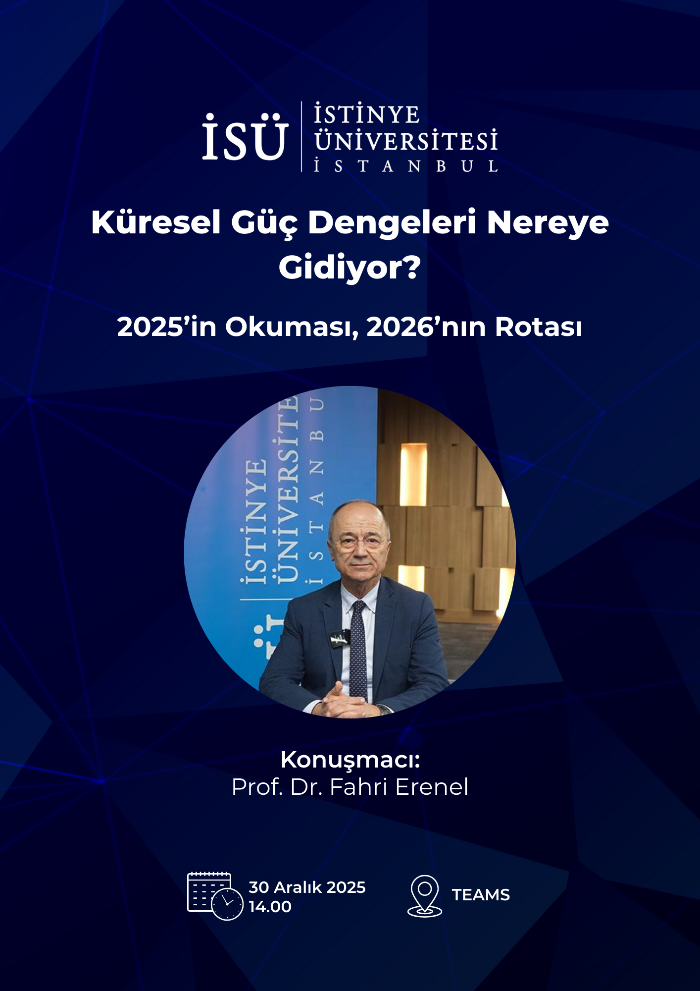 İstinye Üniversitesi, Güvenlik ve Savunma Stratejileri Uygulama ve Araştırma Merkezi tarafından 30 Aralık 2025, saat 14.00'de gerçekleşecek olan “Küresel Güç Dengeleri Nereye Gidiyor?” isimli etkinliğe davetlisiniz.