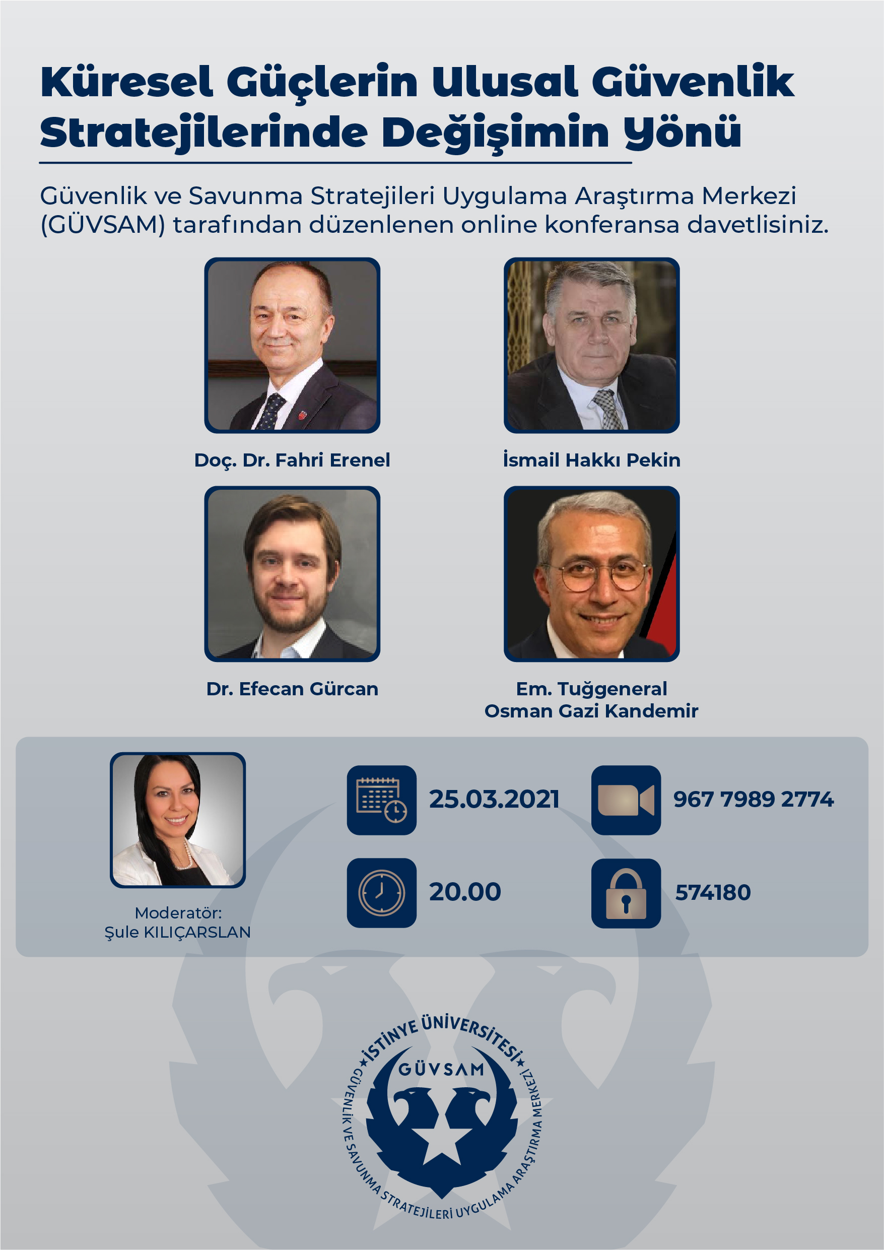 GÜVSAM tarafından düzenlenen "Küresel Güçlerin Ulusal Güvenlik Stratejilerinde Değişimin Yönü" konulu program zoom platformu üzerinden online olarak gerçekleşecektir.