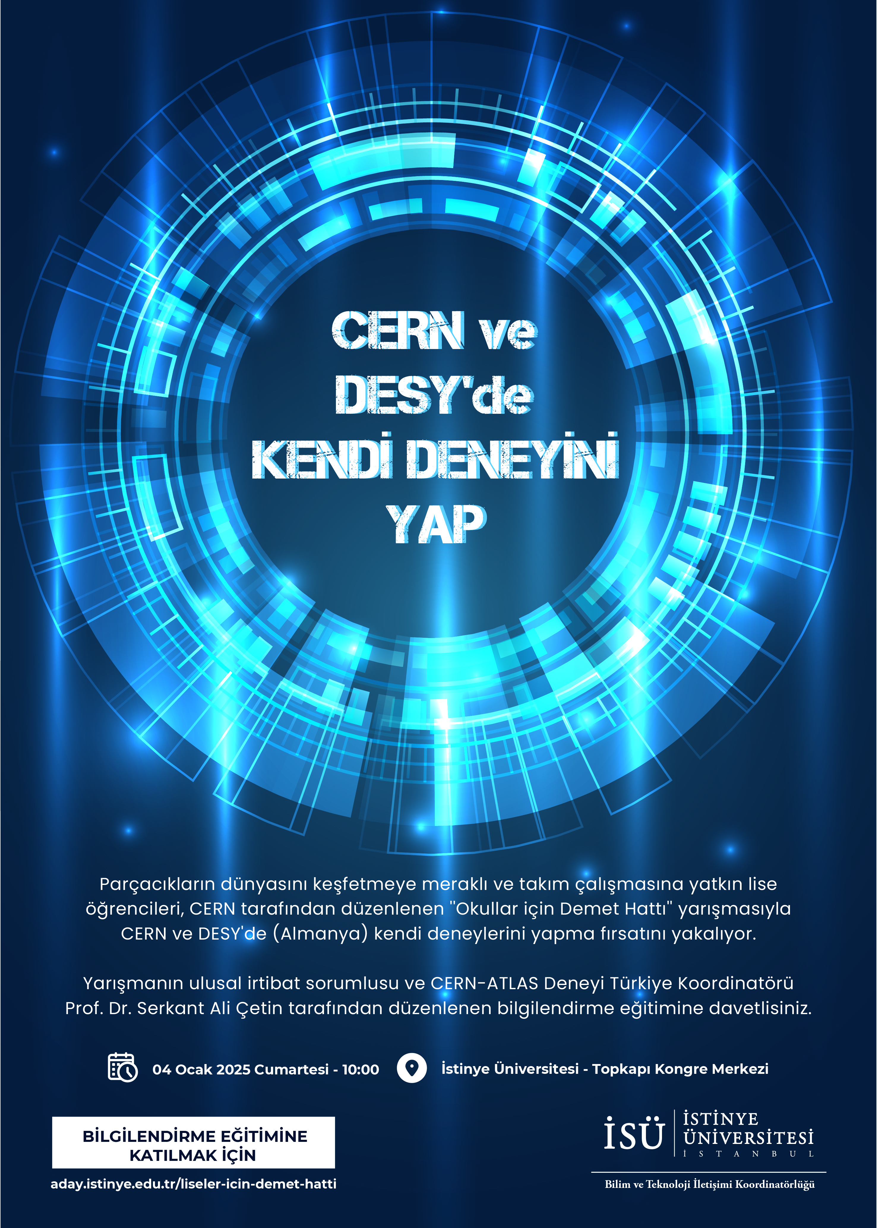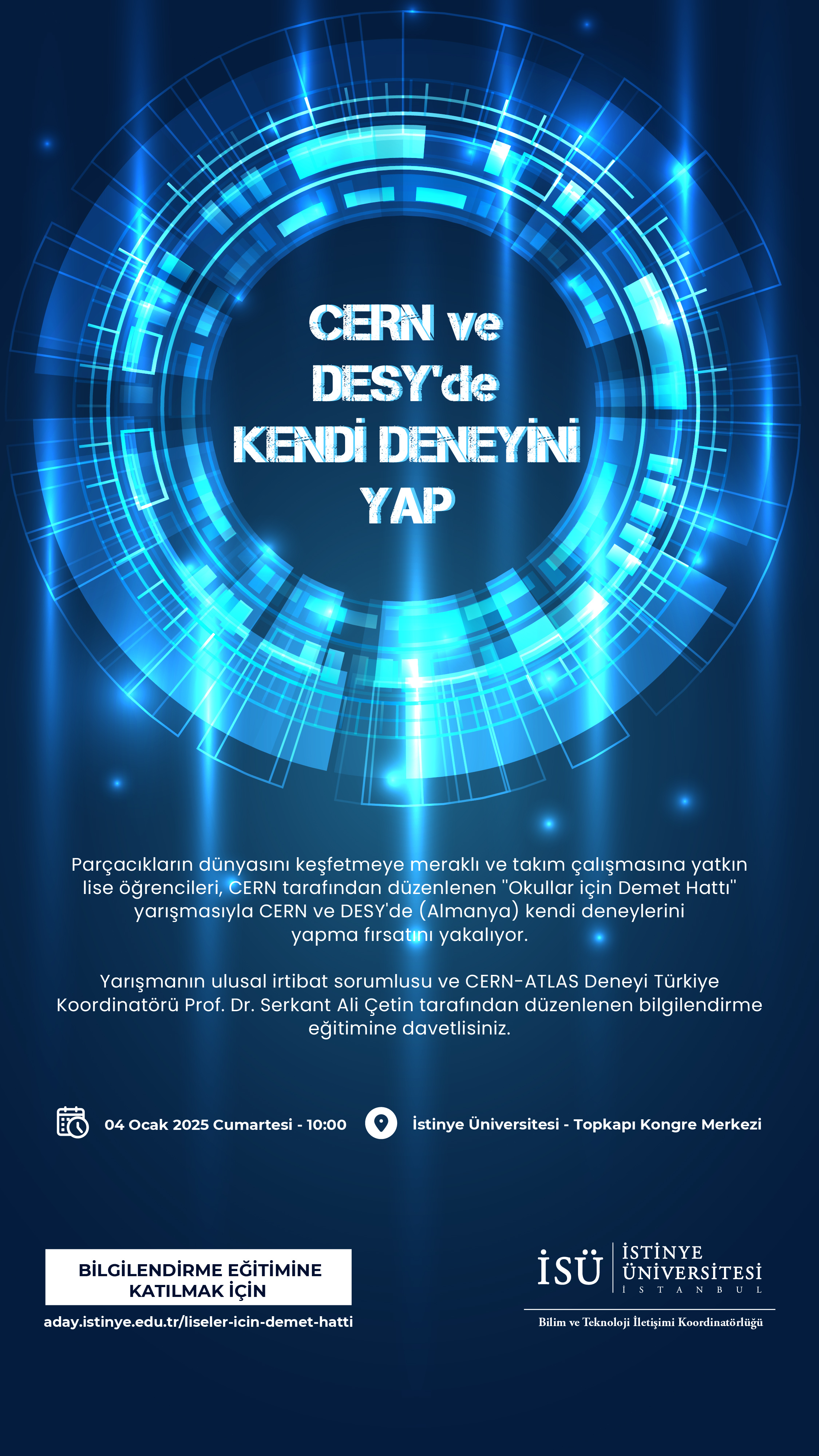 İstinye Üniversitesi Bilim ve Teknoloji İletişimi Koordinatörlüğü tarafından 4 Ocak 2025 Cumartesi günü saat 10.00'da Topkapı Kongre Merkezi'nde gerçekleştirilecek Liseler İçin Demet Hattı Yarışması Bilgilendirme Eğitimi etkinliğine davetlisiniz.
