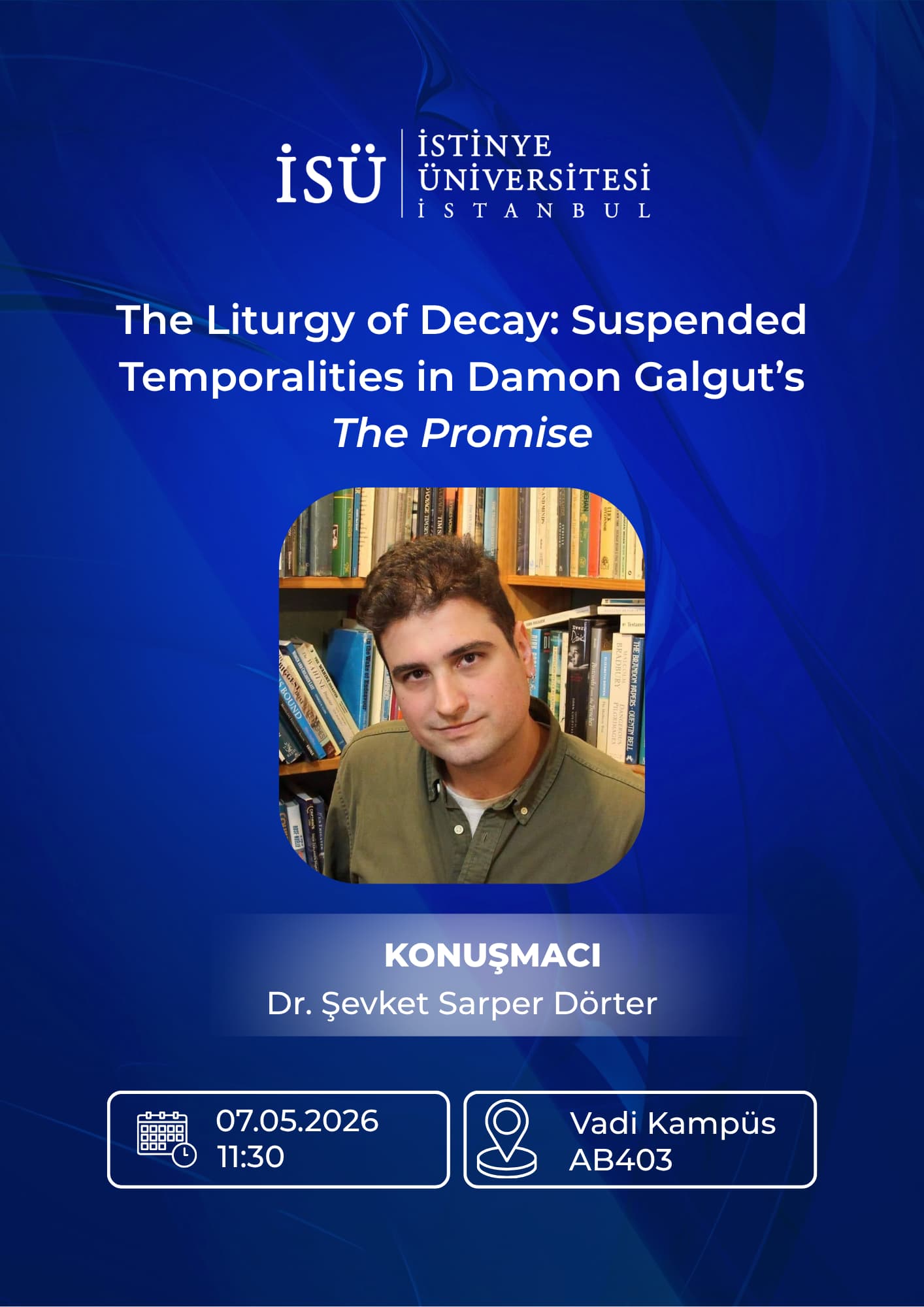 İstinye Üniversitesi, İnsan ve Toplum Bilimleri Fakültesi tarafından 7 Mayıs 2026 tarihinde gerçekleşecek olan “The Liturgy of Decay: Suspended Temporalities in Damon Galgut’s The Promise” isimli etkinliğe davetlisiniz.