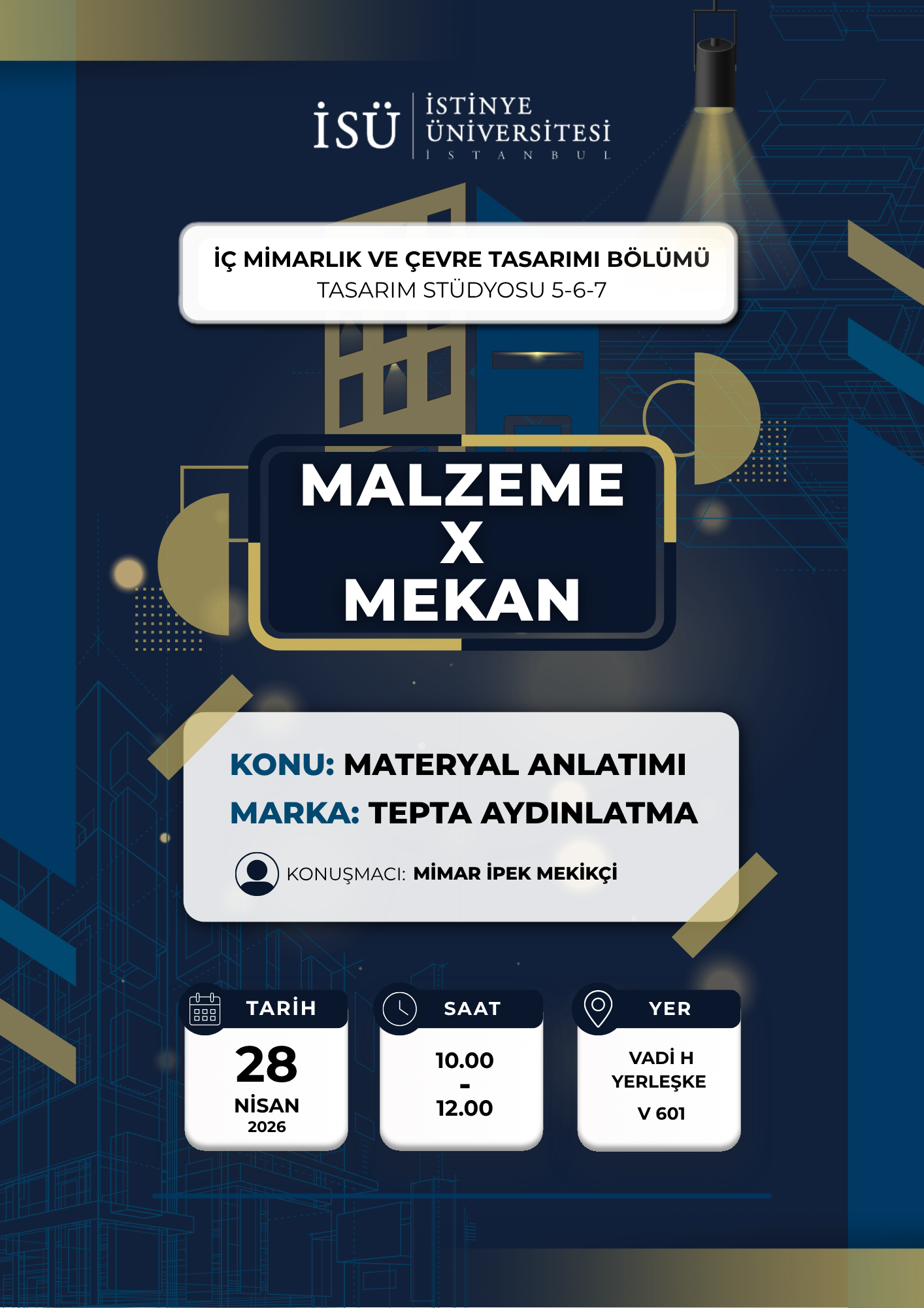 İstinye Üniversitesi, İç Mimarlık ve Çevre Tasarımı Bölümü tarafından 28 Nisan 2026, saat 10.00'da gerçekleşecek olan “Malzeme X Mekan: Materyal Anlatımı” isimli etkinliğe davetlisiniz.