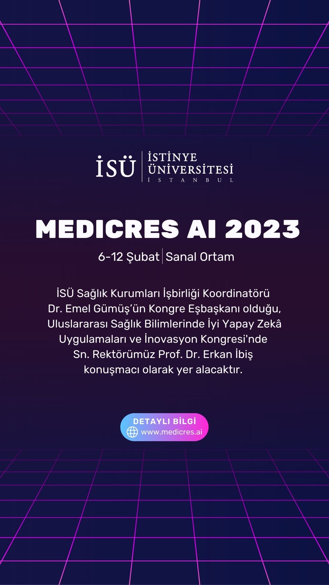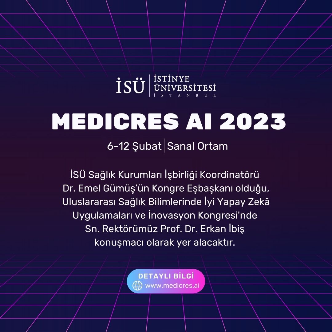 “Uluslararası Sağlık Bilimlerinde İyi Yapay Zekâ Uygulamaları ve İnovasyon Kongresi” (MEDICRES AI 2023) 6-12 Şubat 2023 tarihlerinde sanal ortamda organize edilecektir. Sağlık bilimlerinde yapay zekâ ile ‘insan’ teması, daha sağlıklı bir hayat arayışında Veri Biliminin yardımı, robotik teknolojilerin sağlık sistemindeki güncel örnekleri ve faydaları, yapay zekâ ve etik uygulamalar gibi konuların ele alınacağı etkinlikte, İstinye Üniversitesi Rektörü Prof. Dr. Erkan İbiş konuşmacı olacaktır. İSÜ Sağlık Kurumları İşbirliği Koordinatörü Dr. Emel Gümüş’ün aynı zamanda Kongre Eşbaşkanı görevini üstleneceği etkinlik için daha ayrıntılı bilgi www.medicres.ai adresinde.