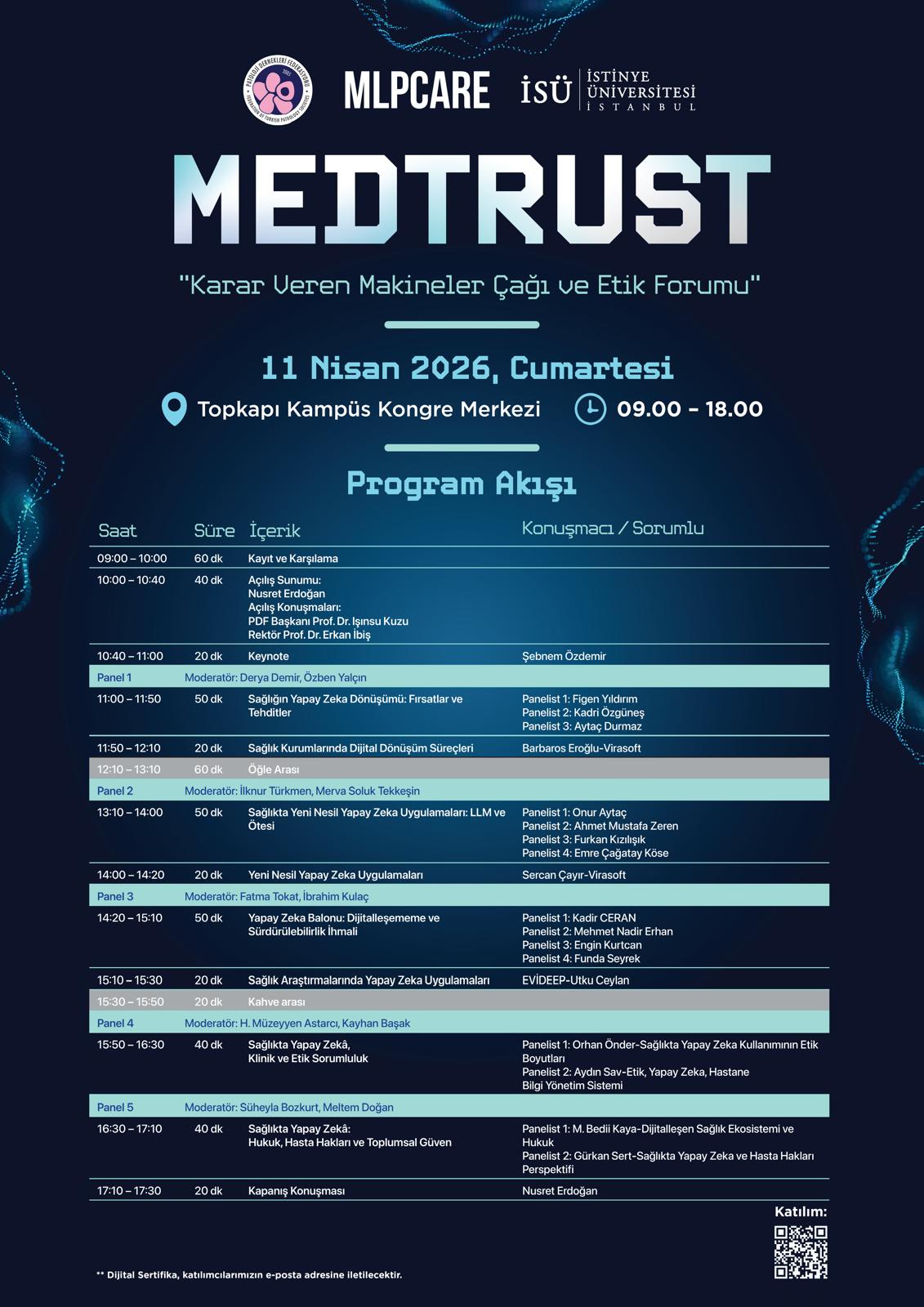 İstinye Üniversitesi ev sahipliğinde 11 Nisan 2026 tarihinde gerçekleşecek olan “MEDTRUST: Karar Veren Makineler Çağı ve Etik Forumu” isimli etkinliğe davetlisiniz.