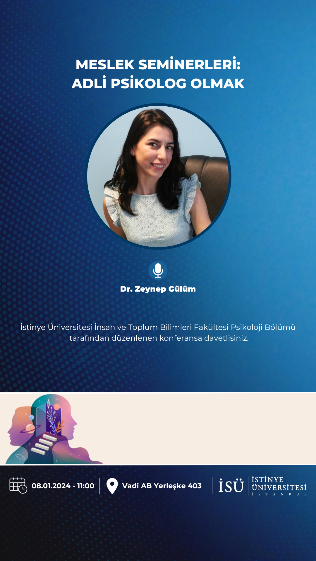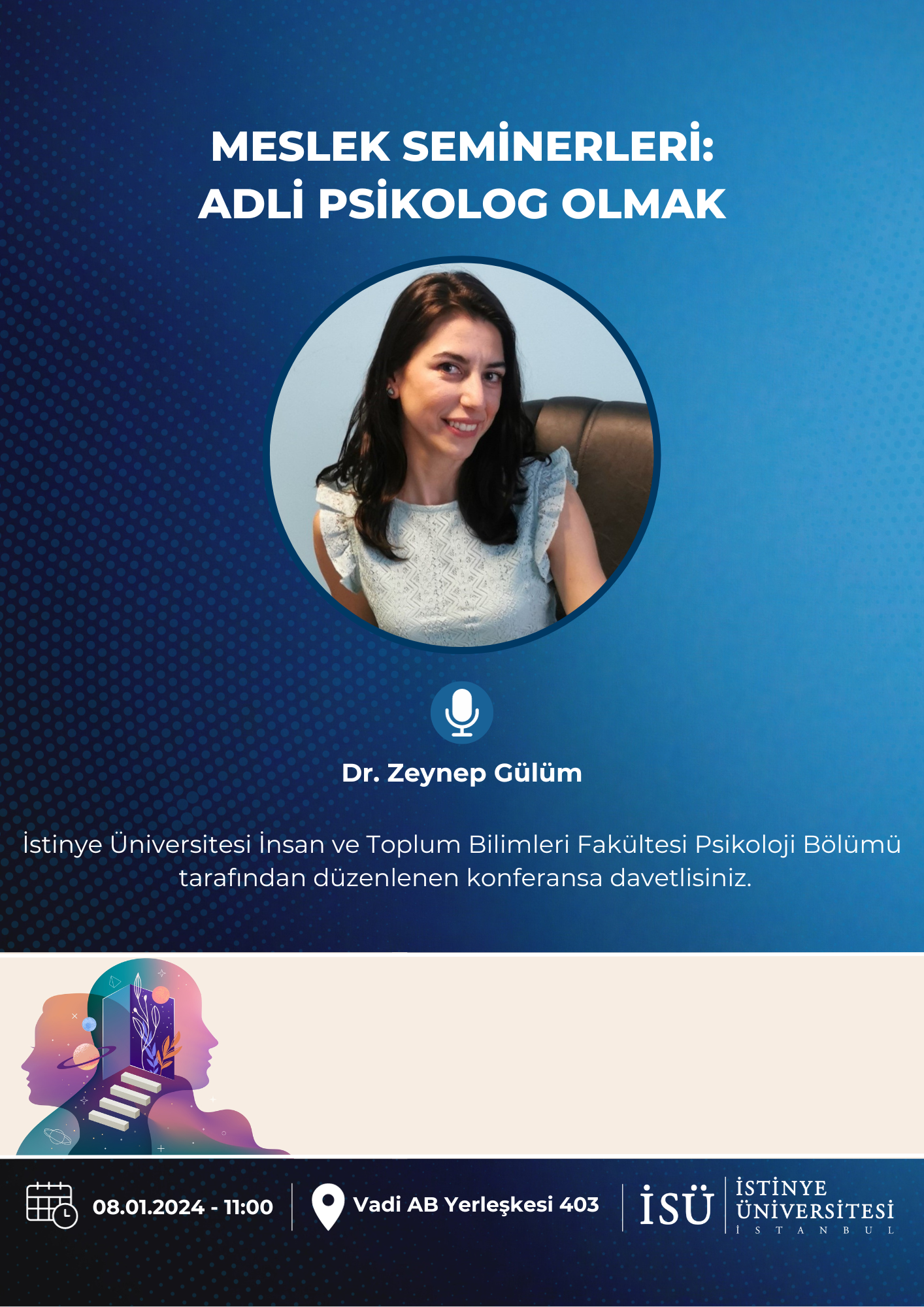 İstinye Üniversitesi İnsan ve Toplum Bilimleri Fakültesi, Psikoloji Bölümü tarafından 08 Ocak 2024 Pazartesi günü saat 11:00'de Vadi AB Yerleşke 403'de gerçekleştirilecek seminere davetlisiniz.