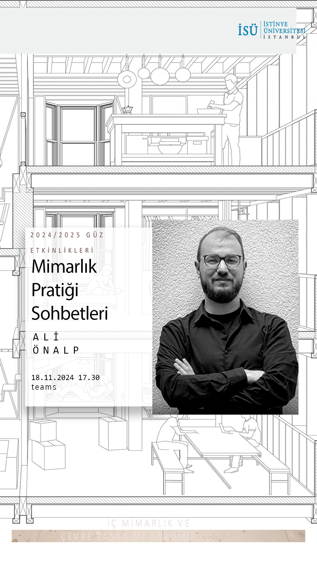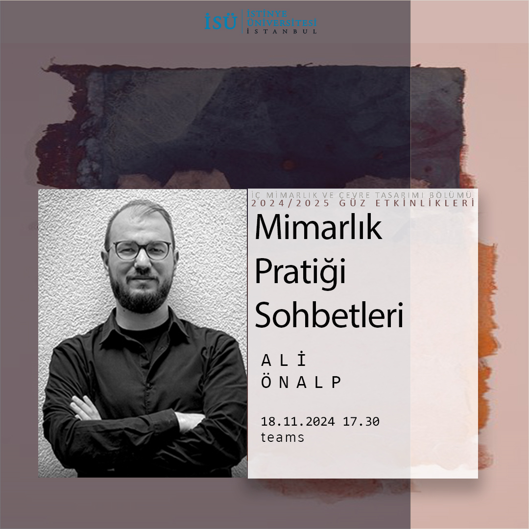 İstinye Üniversitesi, , İç Mimarlık ve Çevre Tasarımı Bölümü tarafından 18 Kasım 2024 tarihlerinde Ali Önalp'in katılımlarıyla Teams üzerinden gerçekleştirilecek "Mimarlık Pratiği Sohbetleri" etkinliğine davetlisiniz.