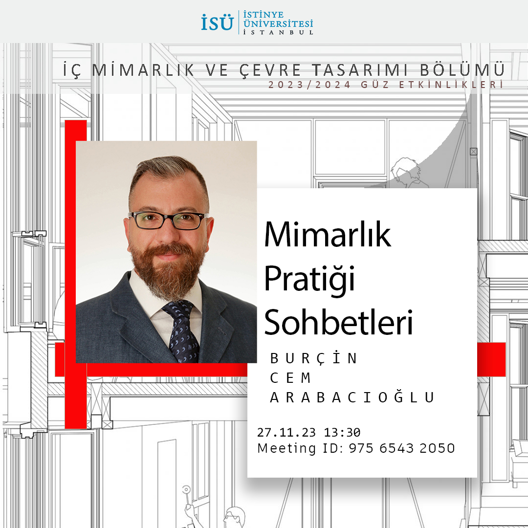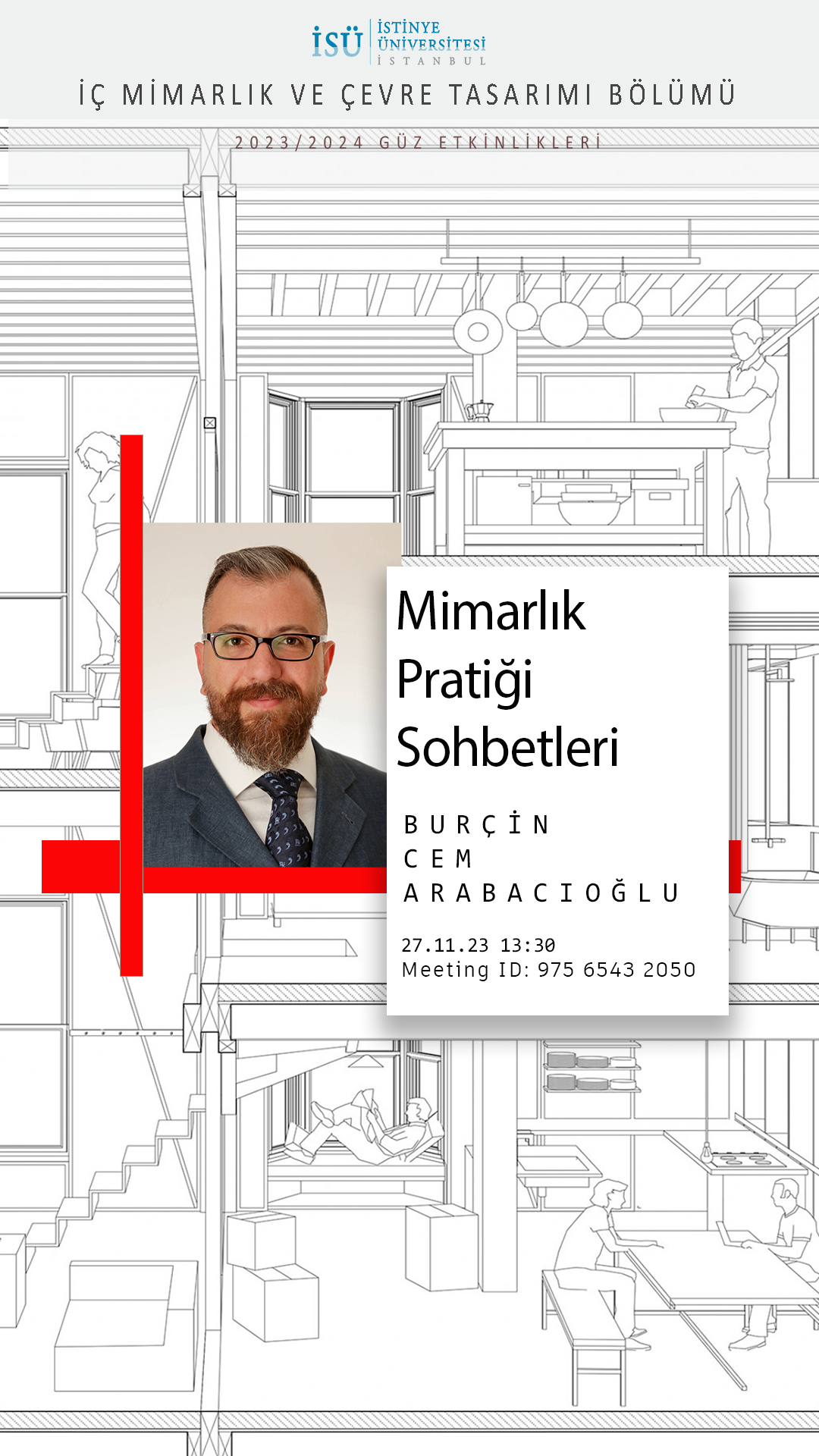 İstinye Üniversitesi İç Mimarlık ve Çevre Tasarımı Bölümü tarafından 27 Kasım 2023 Pazartesi Günü saat 13.30'da çevrim içi olarak gerçekleştirilecek etkinliğe davetlisiniz.