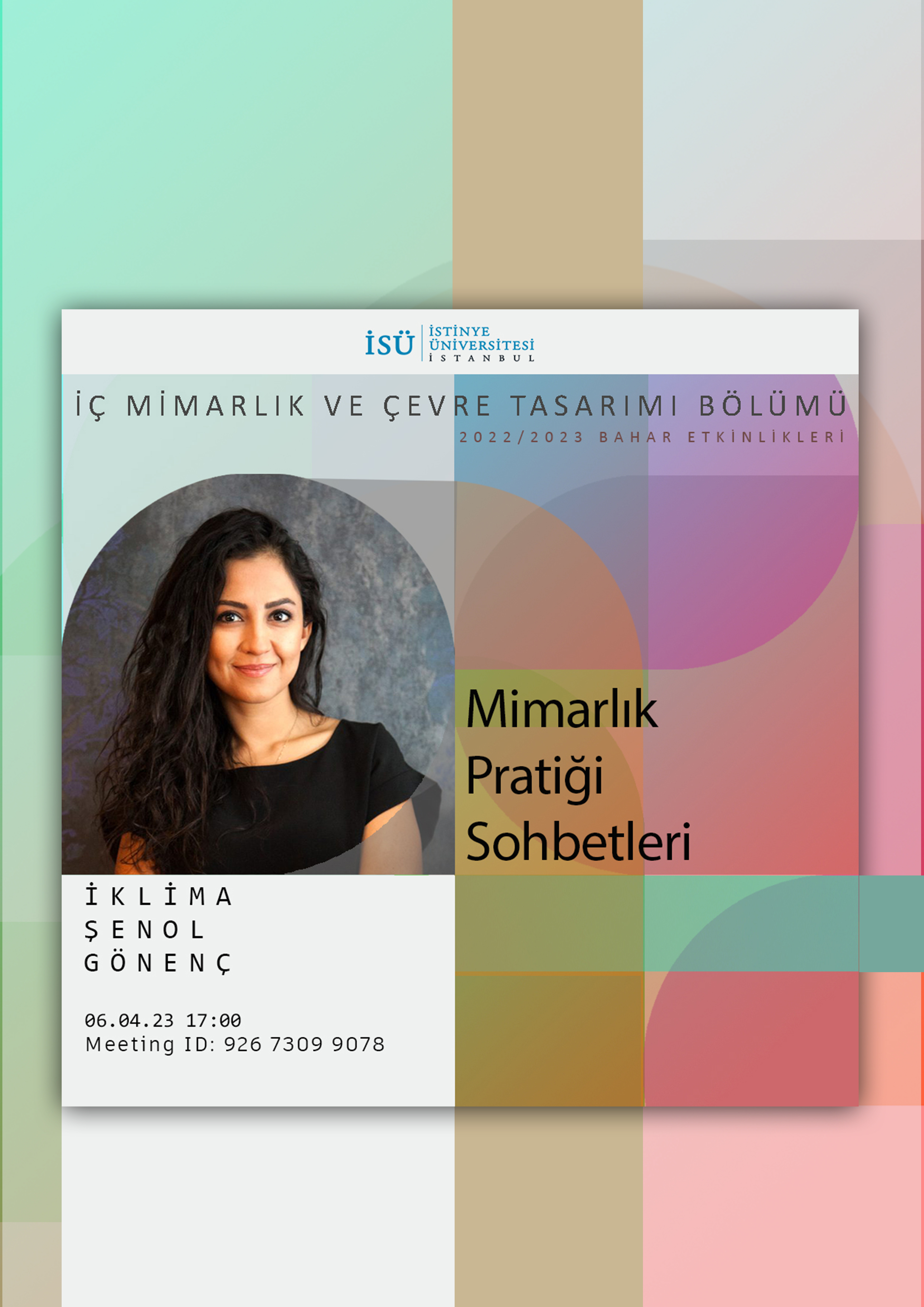 İstinye Üniversitesi İç Mimarlık ve Çevre Tasarımı Bölümü tarafından 6 Nisan Perşembe Günü saat 17.00'de çevrim içi olarak gerçekleştirilecek etkinliğe davetlisiniz.