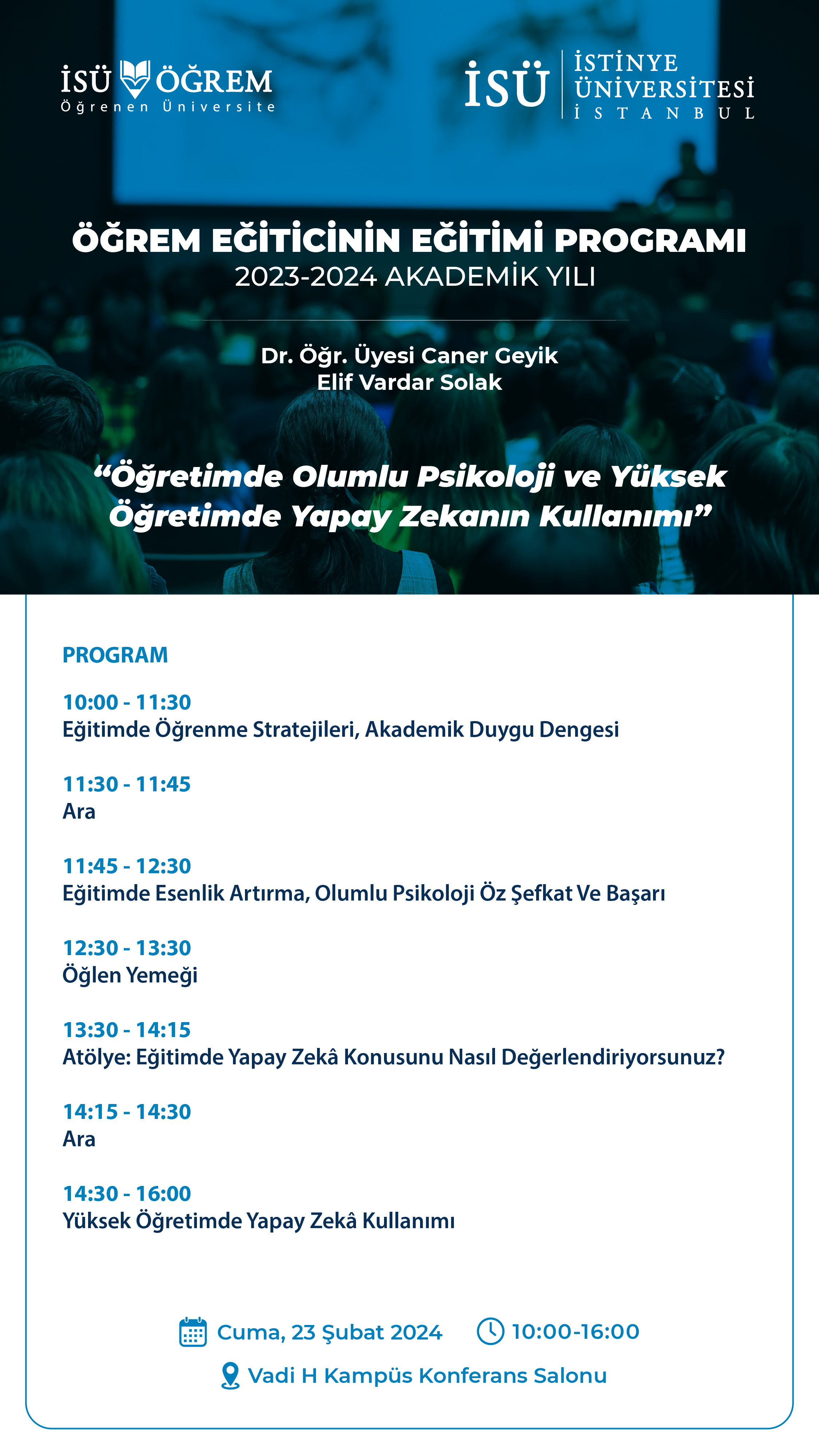 İstinye Üniversitesi, Öğretme ve Öğrenme Merkezi (ÖĞREM) tarafından 23 Şubat 2024 Cuma günü saat 10:00'da Vadi H Yerleşkesi Konferans Salonunda gerçekleştirilecek etkinliğe davetlisiniz.