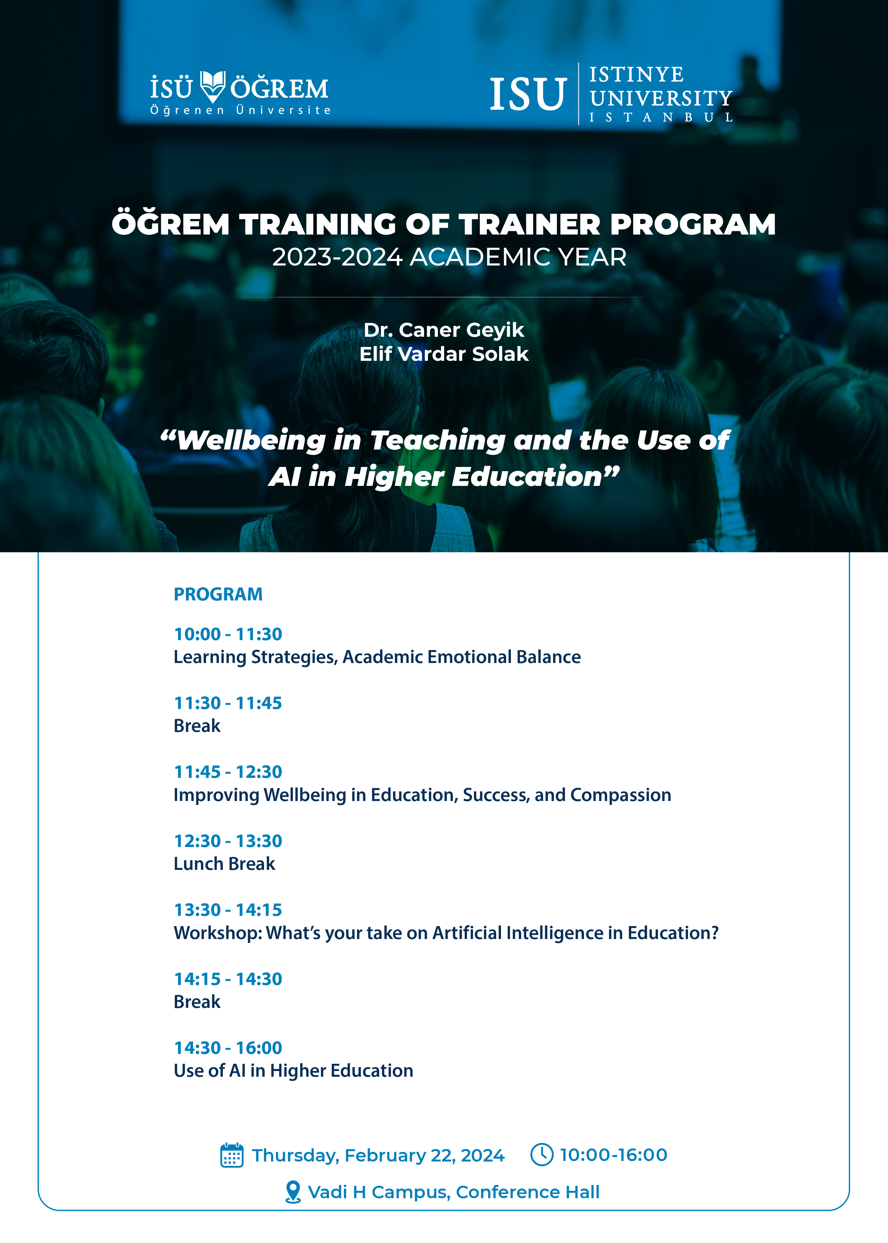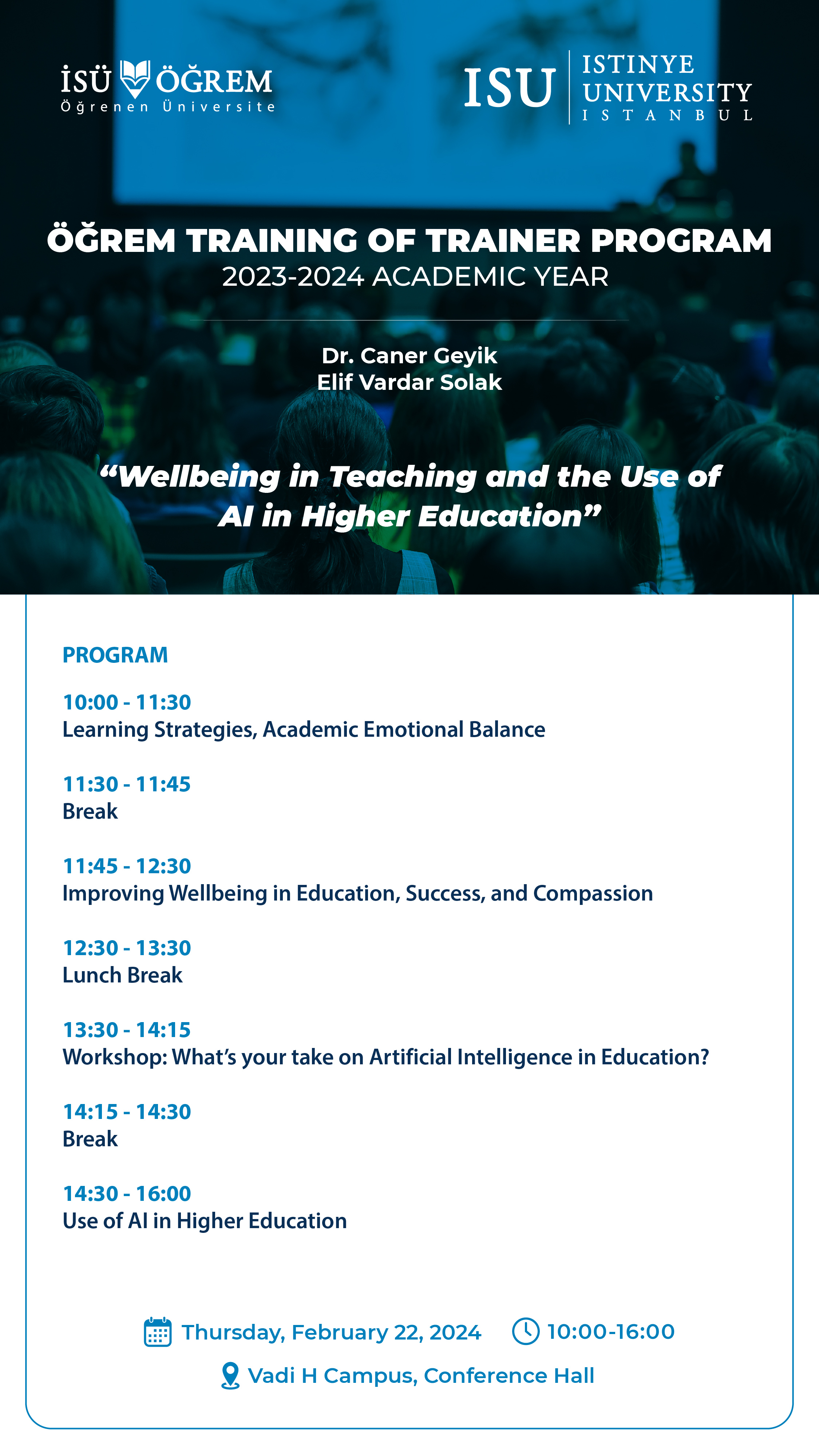 İstinye Üniversitesi, Öğretme ve Öğrenme Merkezi (ÖĞREM) tarafından 22 Şubat 2024 Perşembe günü saat 10:00'da Vadi H Yerleşkesi Konferans Salonunda gerçekleştirilecek etkinliğe davetlisiniz.