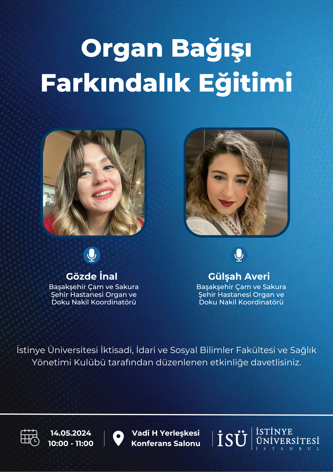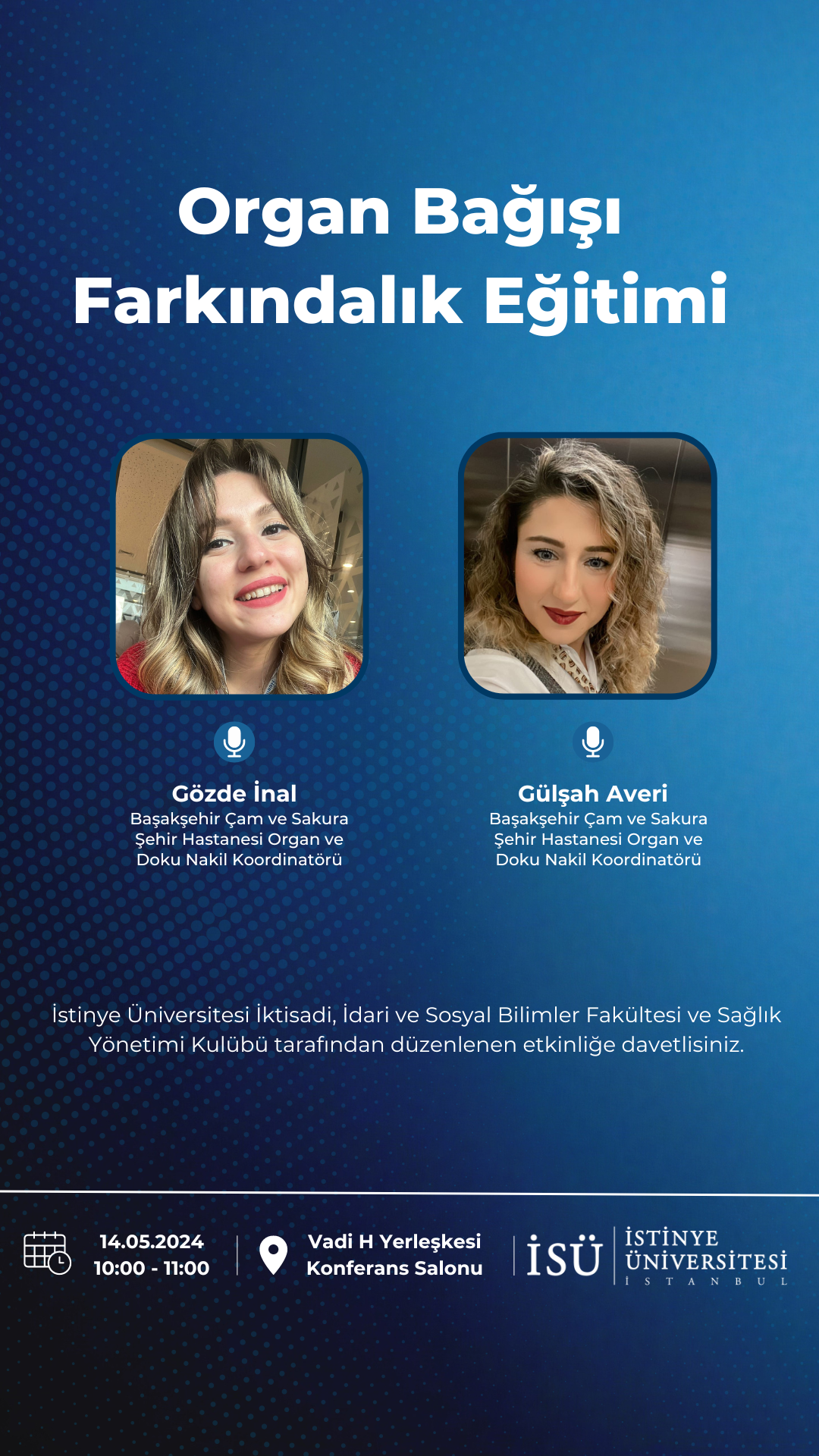 İstinye Üniversitesi İktisadi, İdari ve Sosyal Bilimler Fakültesi ve Sağlık Yönetimi Kulübü tarafından 14 Mayıs 2024 Salı günü saat 10.00'da Vadi H Yerleşkesi Konferans Salonu'nda gerçekleştirilecek etkinliğe davetlisiniz.