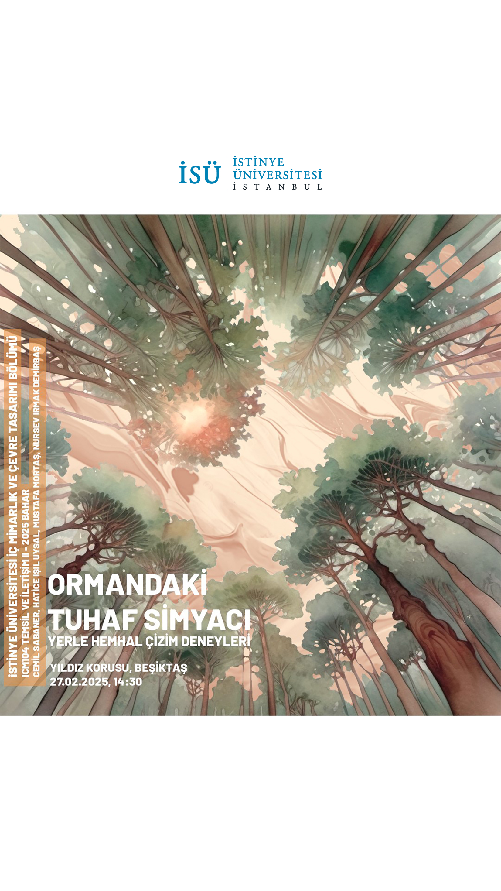İstinye Üniversitesi İç Mimarlık ve Çevre Tasarım Bölümü tarafından Temsil ve İletişim 2 dersi kapsamında 27.02.2025 Perşembe günü, saat 14.30'da Yıldız Korusu’na teknik bir gezi gerçekleştirilecektir.