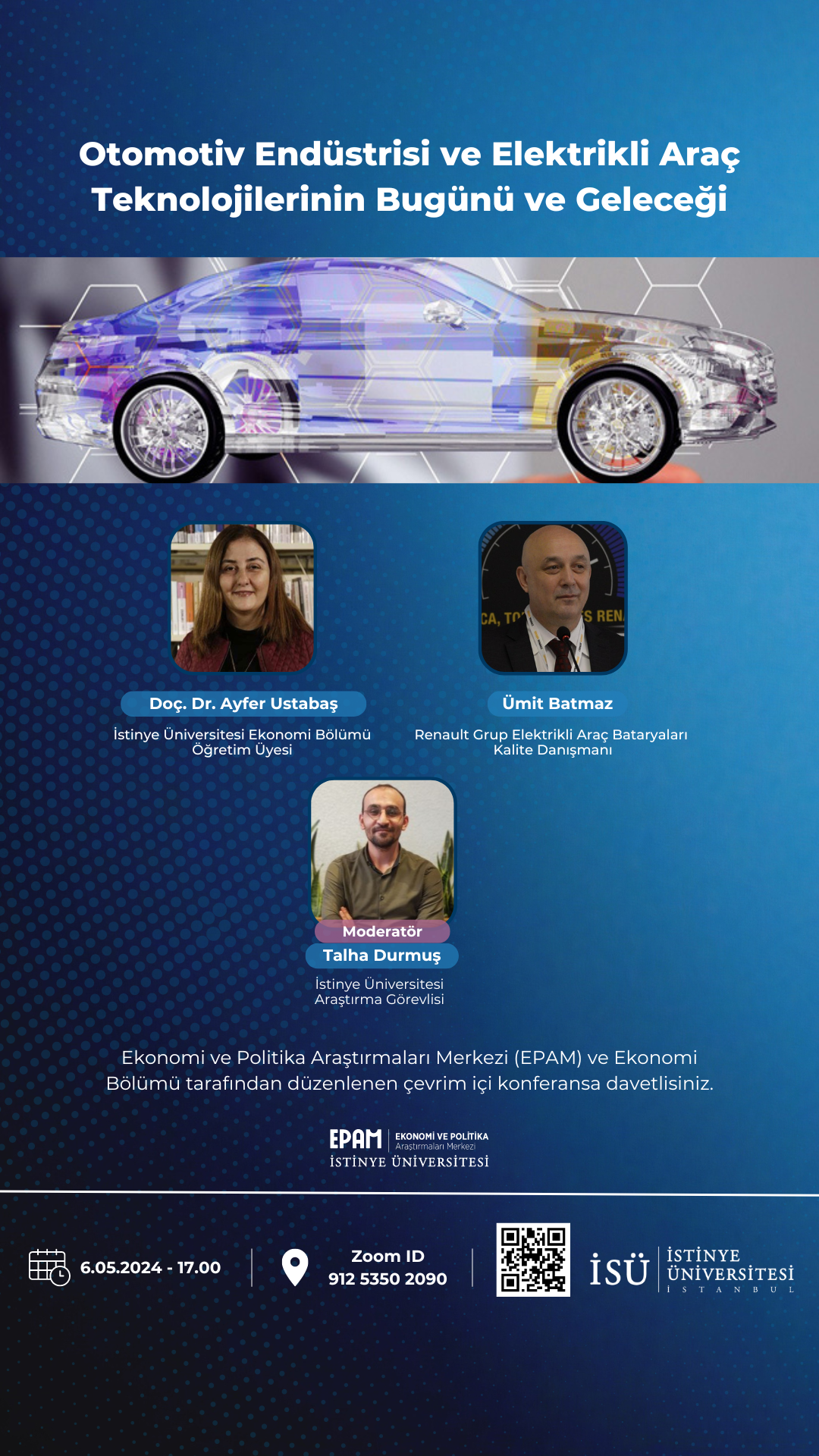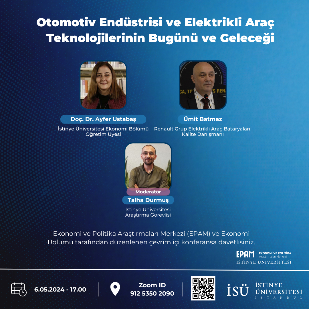 İstinye Üniversitesi Ekonomi ve Politika Araştırmaları Merkezi (EPAM) ve Ekonomi Bölümü tarafından 06 Mayıs 2024 Pazartesi günü saat 17:00'da çevrim içi olarak gerçekleştirilecek konferansa davetlisiniz.