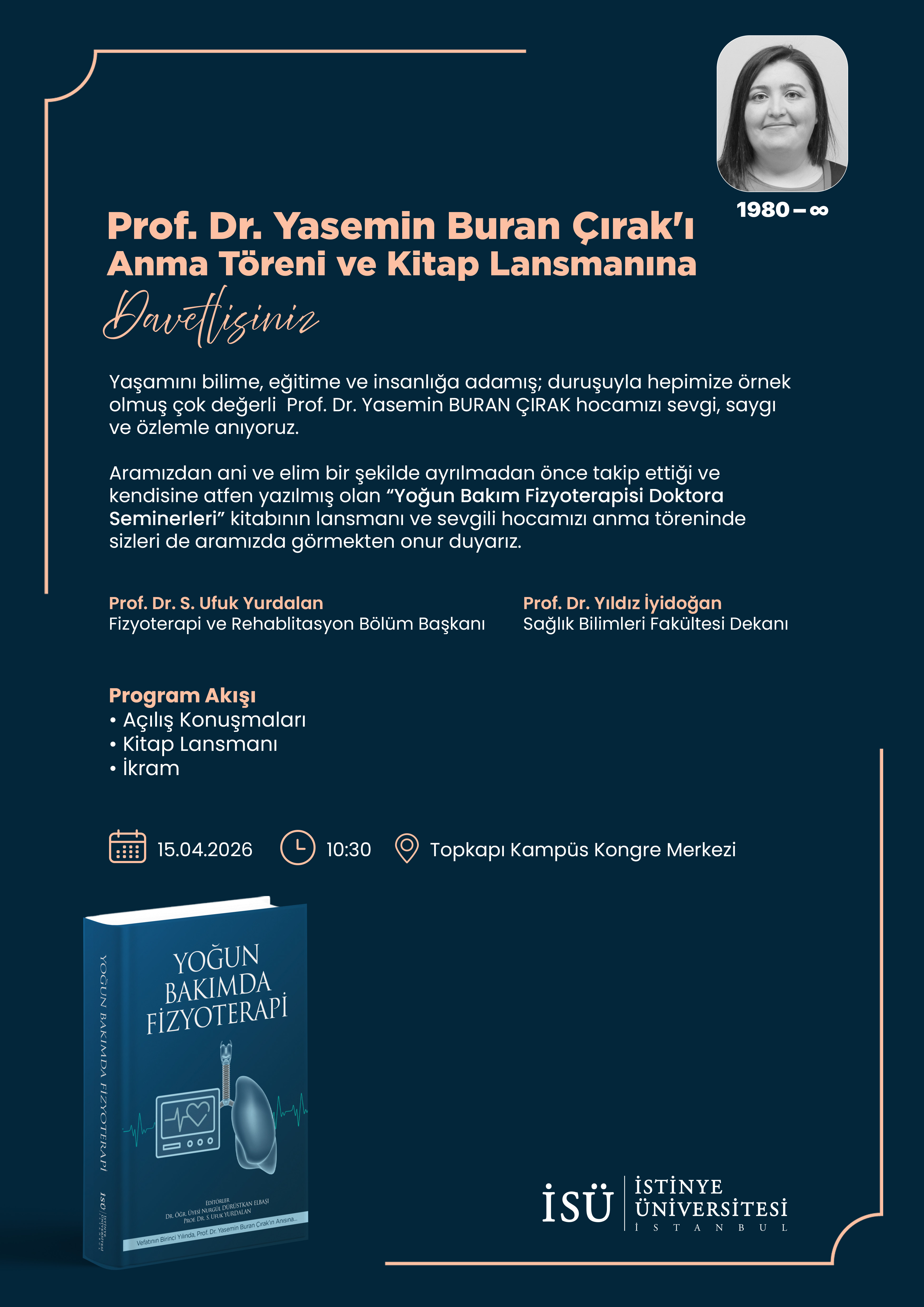 İstinye Üniversitesi, Fizyoterapi ve Rehabilitasyon Bölümü tarafından 15 Nisan 2026, saat 10.30'da gerçekleşecek olan “Prof. Dr. Yasemin Buran Çırak’ı Anma Töreni ve Yoğun Bakımda Fizyoterapi Kitap Lansmanı” isimli etkinliğe davetlisiniz.