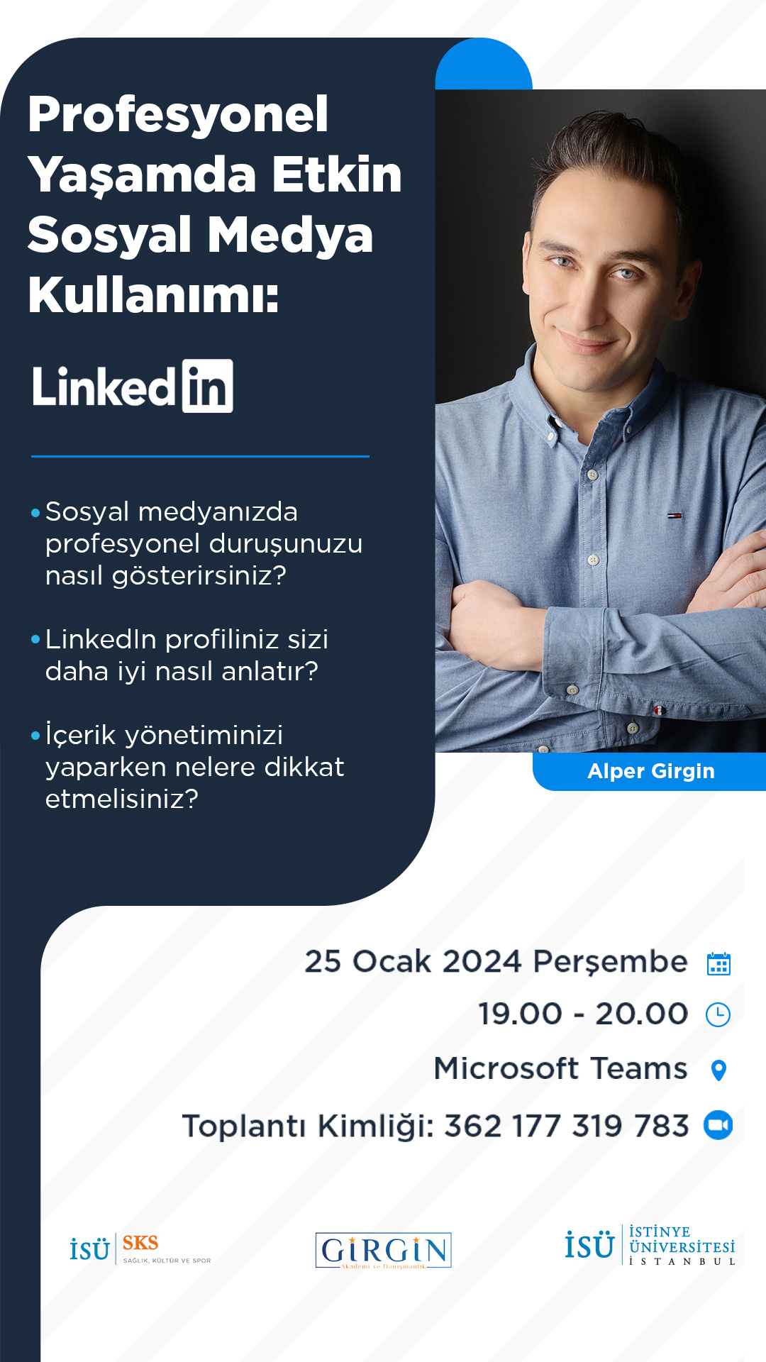 İSÜ Mezun İlişkileri Ofisi tarafından düzenlenen Yetenek Koçu ve İK Danışmanı Alper Girgin'in Konuk olacağı "Profesyonel Yaşamda Etkin Sosyal Medya Kullanımı: LinkedIn" konulu etkinliğe davetlisiniz.