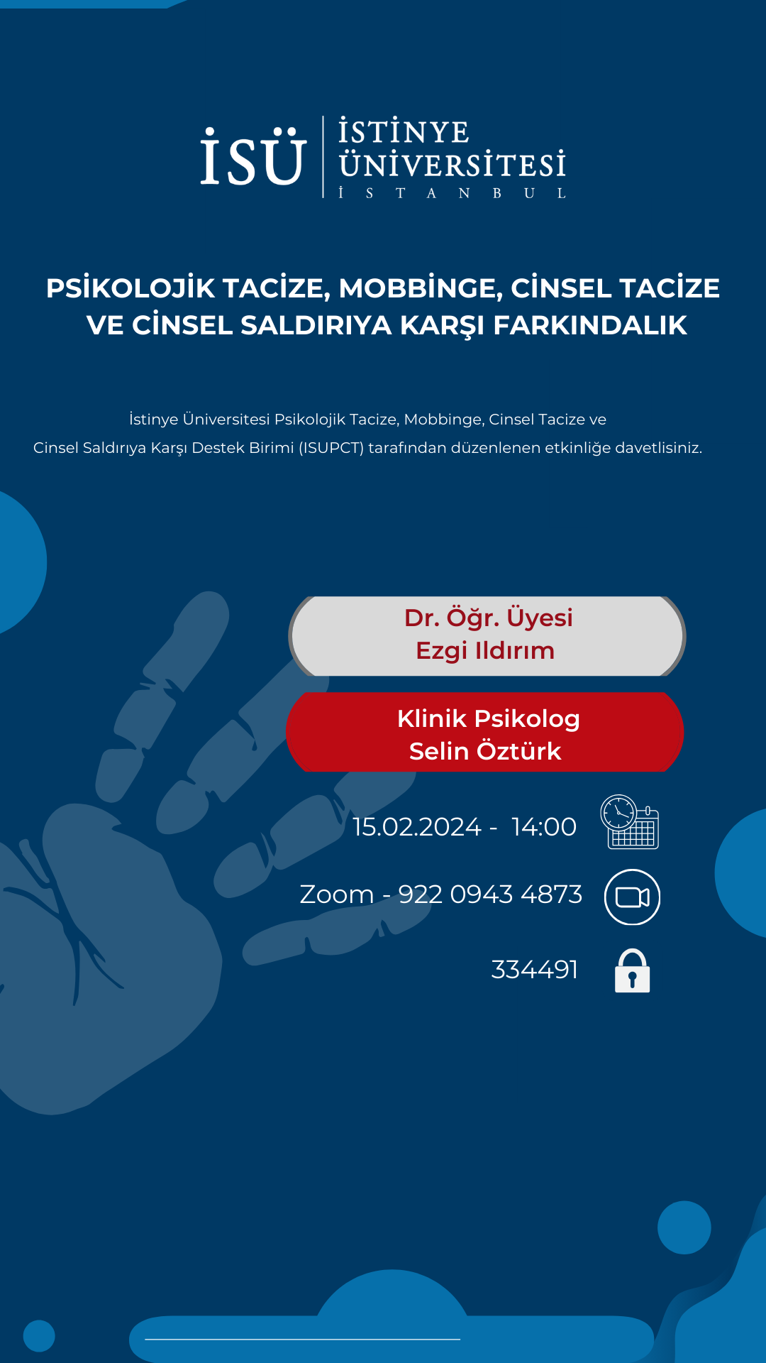 İstinye Üniversitesi, Psikolojik Tacize, Mobbinge, Cinsel Tacize ve Cinsel Saldırıya Karşı Destek Birimi (ISUPCT) ile Dr. Öğr. Üyesi Ezgi Ildırım ve Klinik Psikolog Selin Öztürk’ün sunumlarıyla 15 Şubat 2024 saat 14:00’te çevrim içi olarak gerçekleştirilecek etkinliğe davetlisiniz.