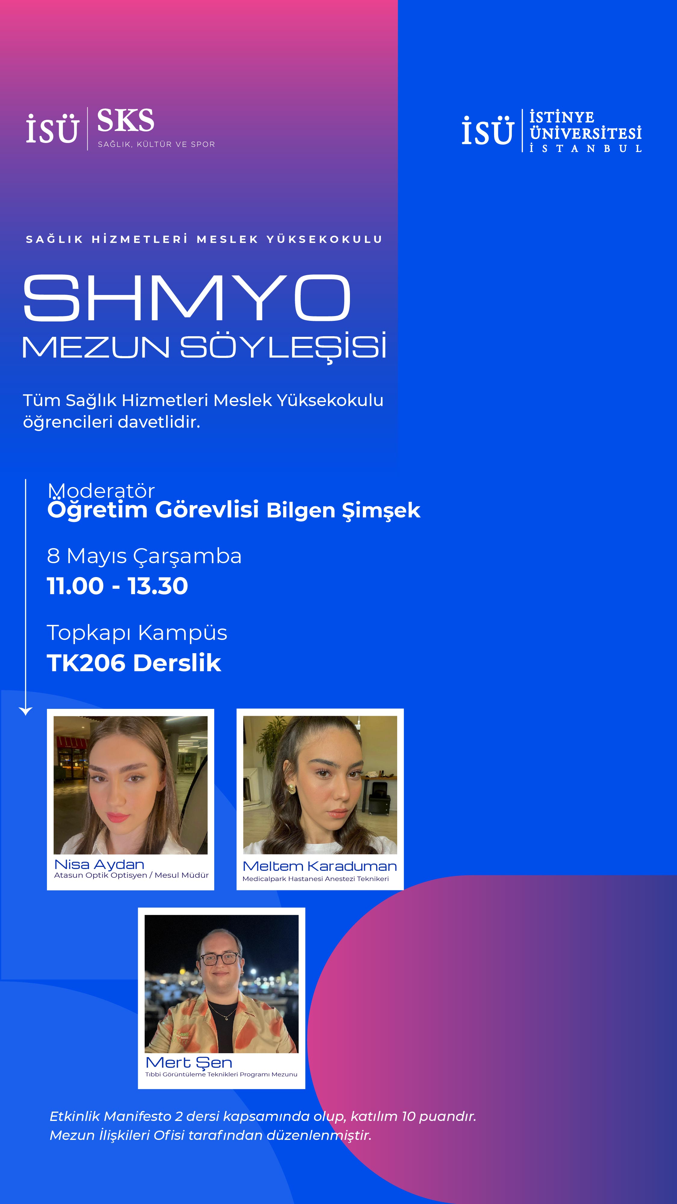 8 Mayıs 2024 Cuma günü saat 11:00'da Topkapı Kampüs TK206'da gerçekleştirilecek olan Sağlık Hizmetleri Meslek Yüksekokulu Mezun Söyleşisi etkinliğine tüm Sağlık Hizmetleri Meslek Yüksekokulu öğrencileri davetlidir.