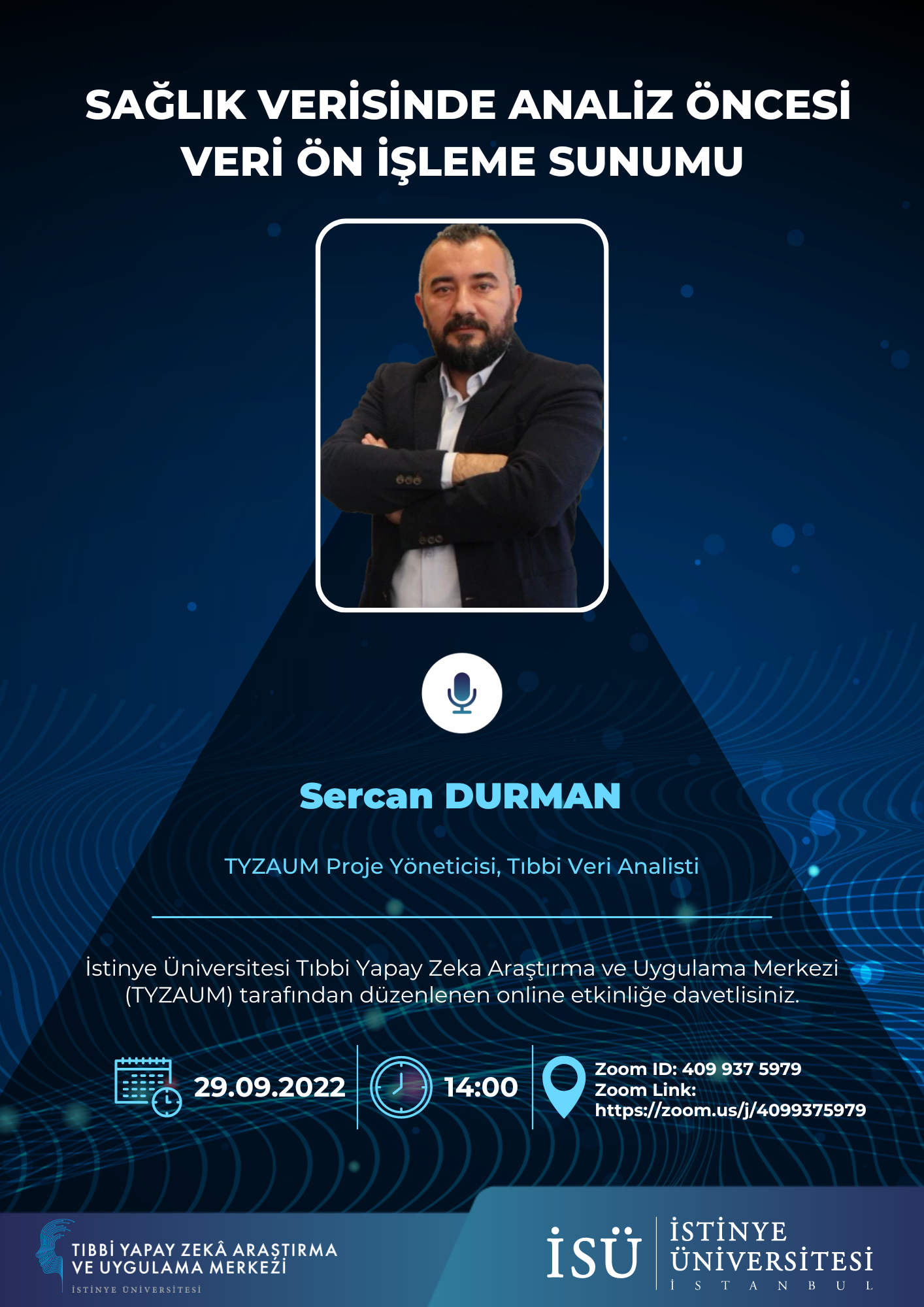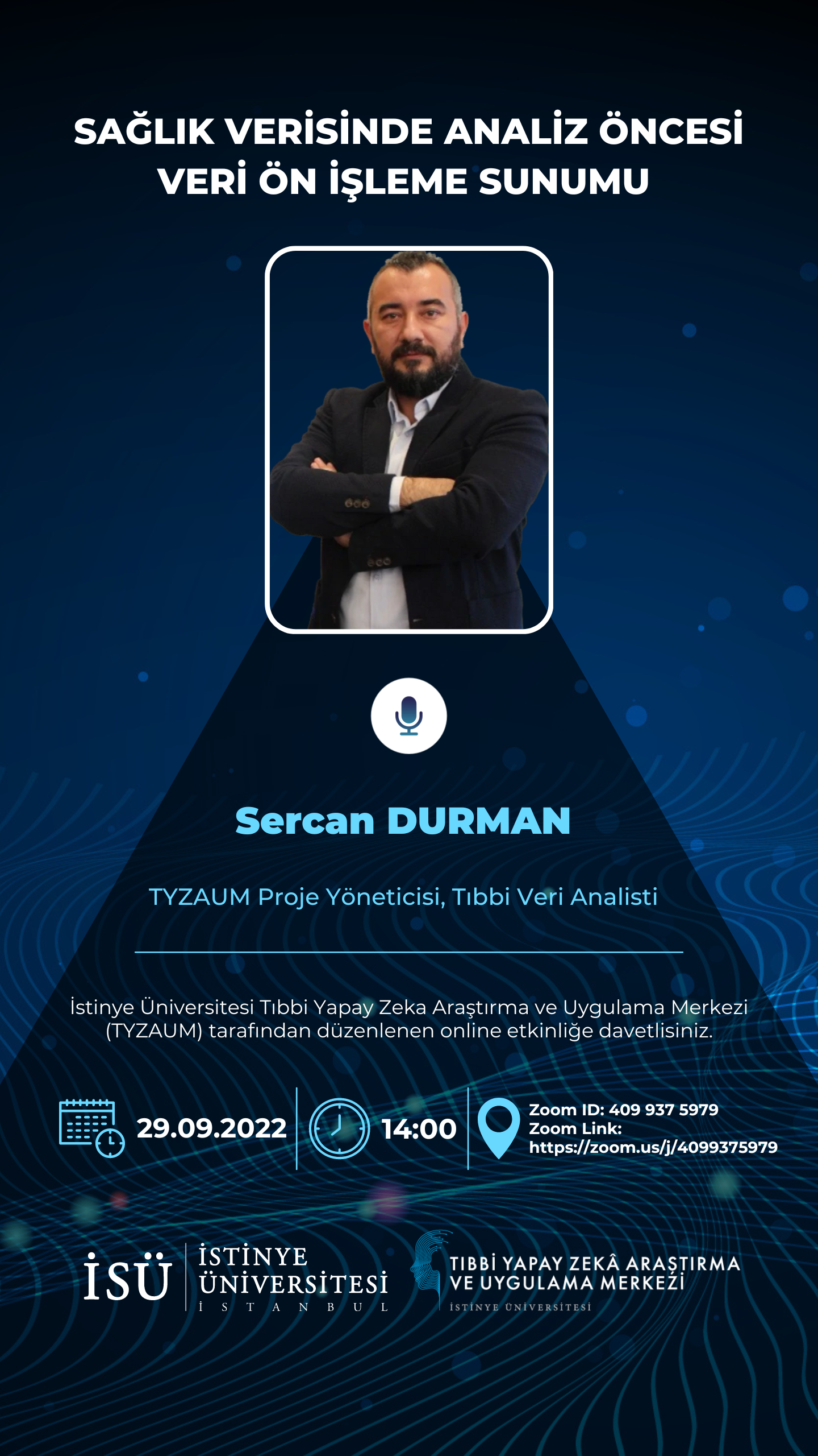 İstinye Üniversitesi Tıbbi Yapay Zeka Araştırma ve Uygulama Merkezi (TYZAUM) tarafından 29 Eylül Perşembe Günü saat 14.00'da çevrim içi olarak gerçekleştirilecek etkinliğe davetlisiniz.