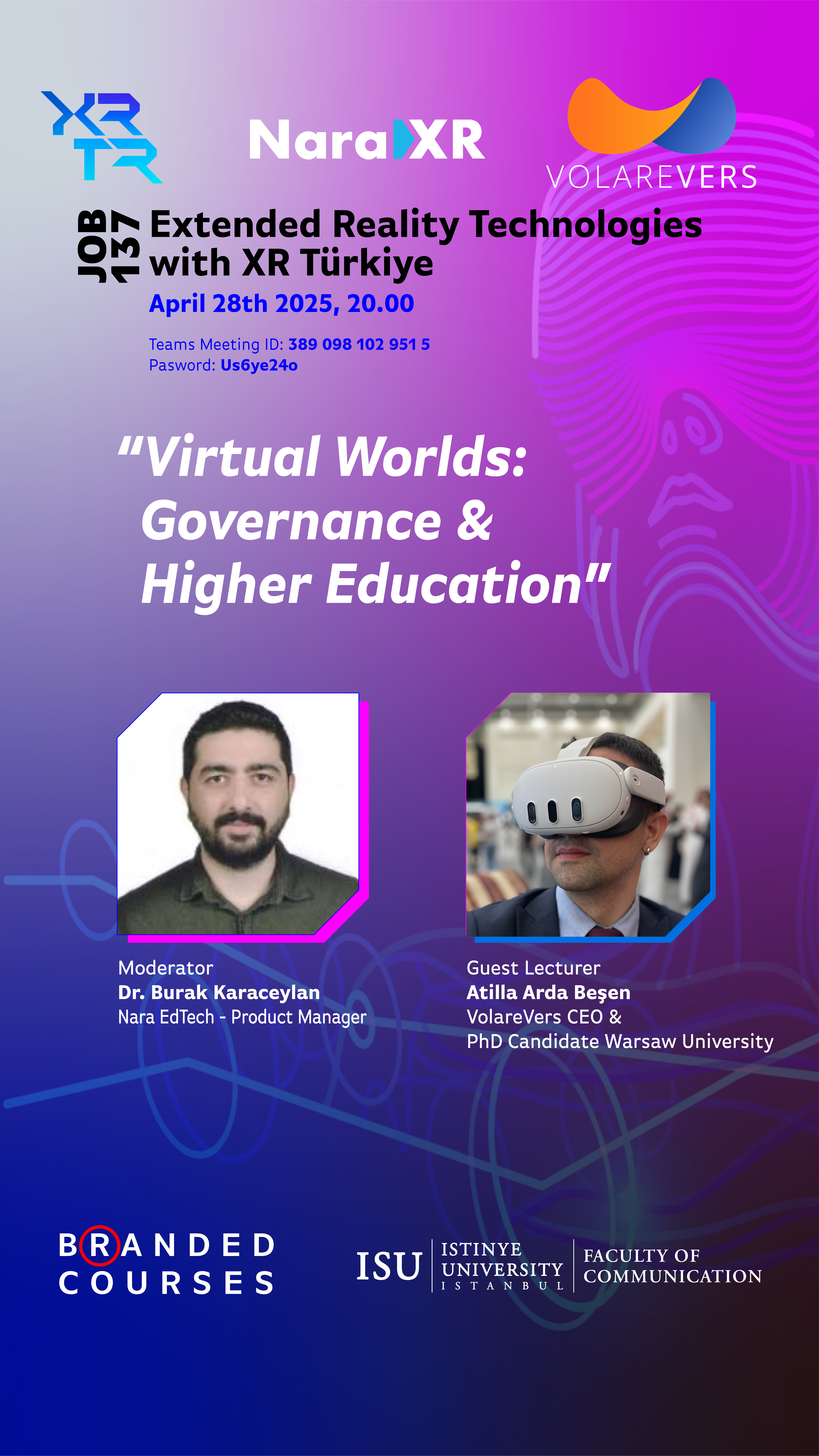 İstinye Üniversitesi İletişim Fakültesi tarafından 28 Nisan 2025 Pazartesi günü, saat 20.00'da JOB137 XR Türkiye ile Genişletilmiş Gerçeklik Teknolojileri markalı dersi kapsamında XR Türkiye, NaraXR ve VolareVers işbirliğinde gerçekleştirilecek VolareVers Kurucusu Atilla Arda Beşen'in konuşmacı olarak katılacağı, NaraXR Ürün Planlamacısı Dr. Burak Karaceylan moderasyonundaki "Sanal Dünyalar: Yönetişim ve Yükseköğretim" söyleşisine davetlisiniz.