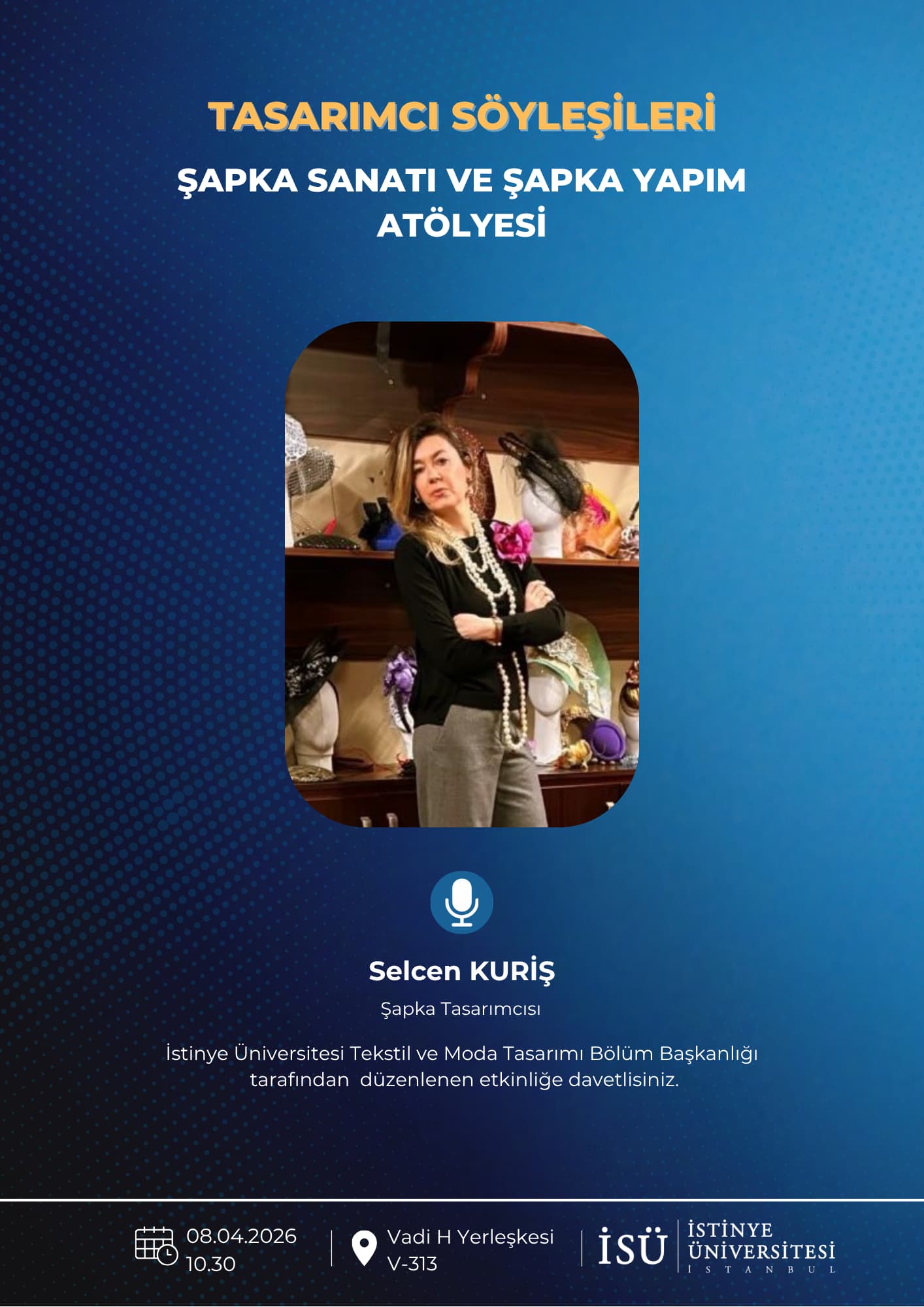 İstinye Üniversitesi, Tekstil ve Moda Tasarımı Bölümü tarafından 8 Nisan 2026, saat 10.30'da gerçekleşecek olan “Şapka Sanatı ve Şapka Yapım Atölyesi” isimli etkinliğe davetlisiniz.