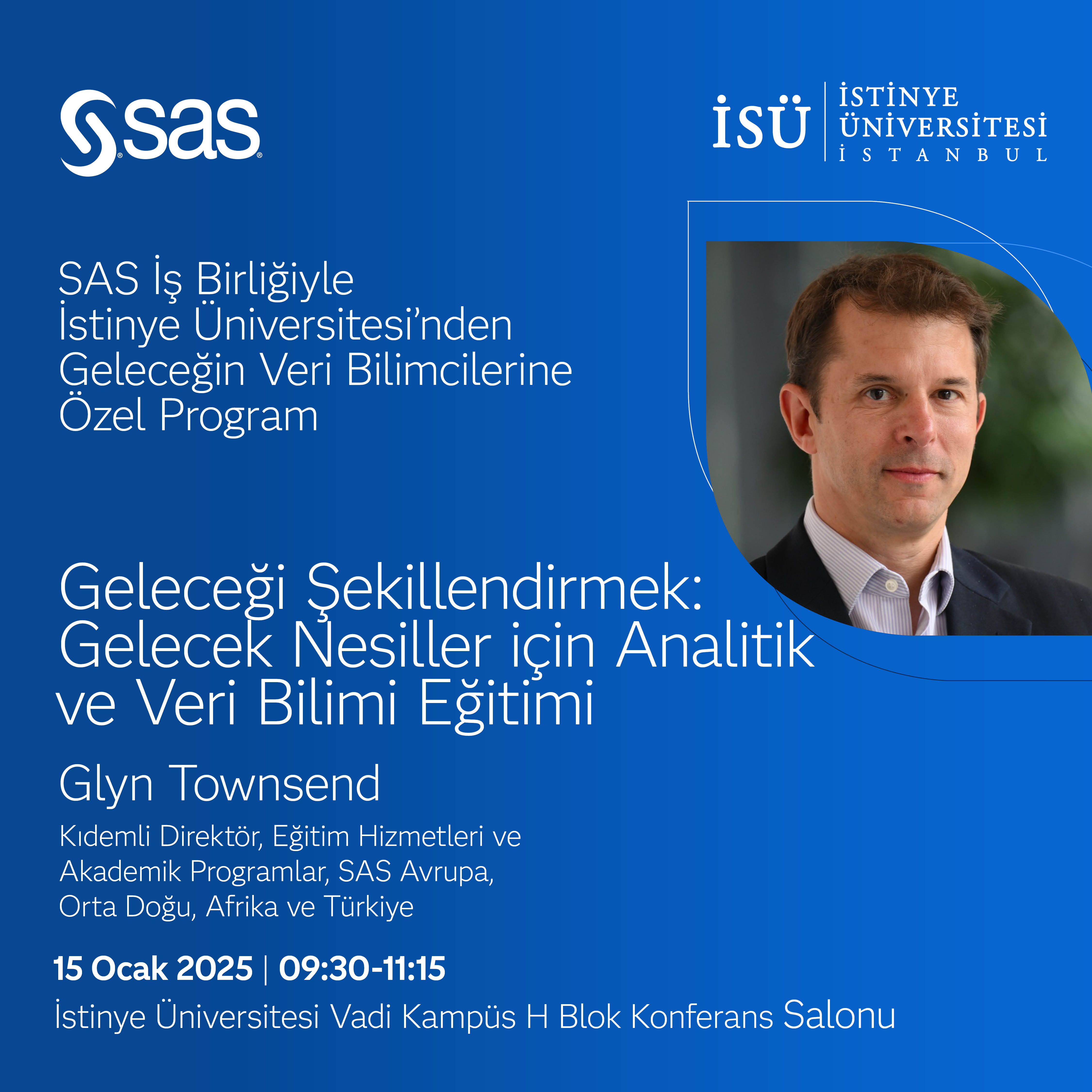 SAS ve İstinye Üniversitesi İşbirliğiyle açılan eğitim programının lansmanı, 15 Ocak Çarşamba günü İstinye Üniversitesi Vadi H Kampüs Konferans Salonu’nda gerçekleşecek. SAS Avrupa, Orta Doğu, Afrika ve Türkiye Eğitim Hizmetleri ve Akademik Programlar Kıdemli Direktörü Glyn Townsend’ın eğitim programına yönelik konuşmasının ardından düzenlenecek panele, Türkiye ve Orta Asya SAS Genel Müdürü Rasim Eğri, SAS Profesyonel Hizmetler Kurul Danışmanı ve Dr. Öğr. Üyesi Yasemin Yücel Karasu, İstinye Üniversitesi Rektörü Prof. Dr. Erkan İbiş ve Mütevelli Heyet Başkanı Dr. Muharrem Usta katılım sağlayacak.