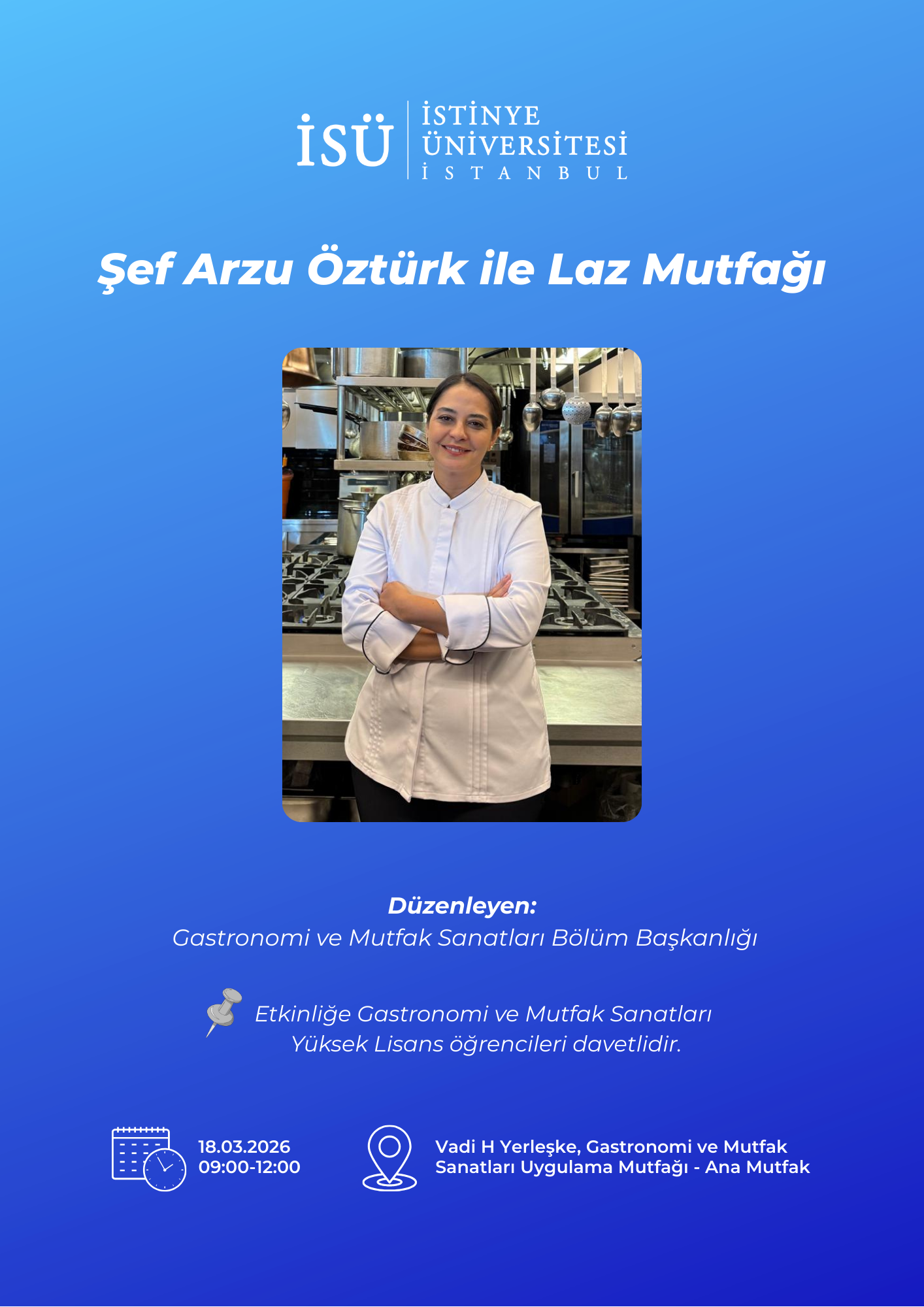 İstinye Üniversitesi, Gastronomi ve Mutfak Sanatları Bölümü tarafından 18 Mart 2026, saat 09.00'da gerçekleşecek olan “Şef Arzu Öztürk ile Laz Mutfağı” isimli etkinliğe davetlisiniz.
