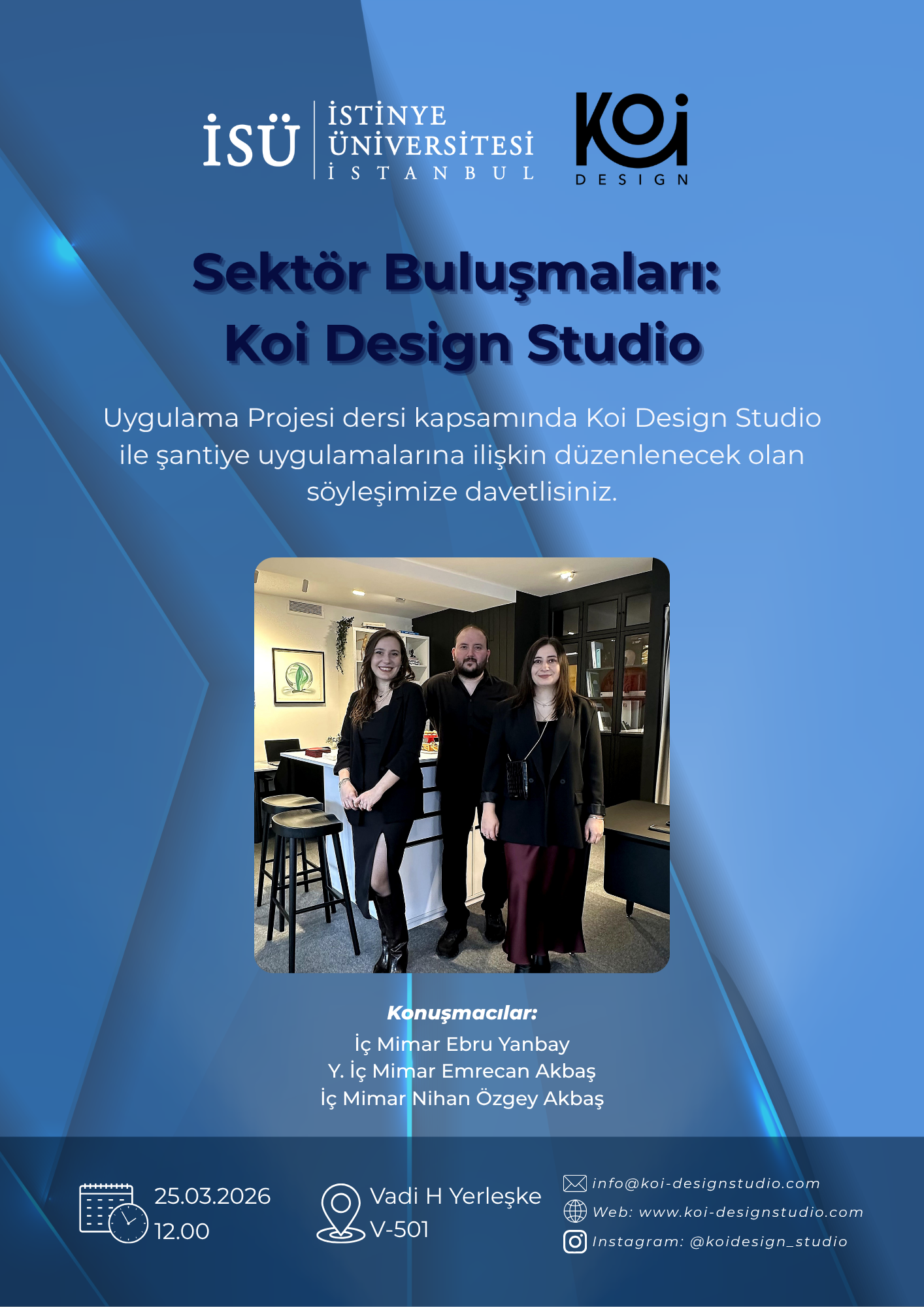 İstinye Üniversitesi, İç Mimarlık ve Çevre Tasarımı Bölümü tarafından 25 Mart 2026, saat 12.00'de gerçekleşecek olan “Sektör Buluşmaları: Koi Design Studio” isimli etkinliğe davetlisiniz.