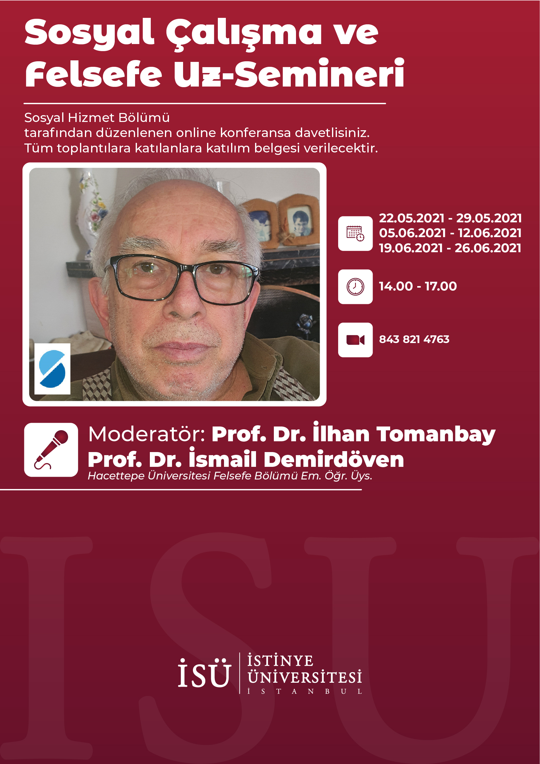 Hacettepe Üniversitesi Felsefe Bölümü Em. Öğr. Üys. Prof. Dr. İsmail DEMİRDÖVEN hocanın katkılarıyla 6 hafta boyunca Cumartesi günleri saat 14.00-17.00 arasında zoom platformu üzerinden online olarak gerçekleşecektir.